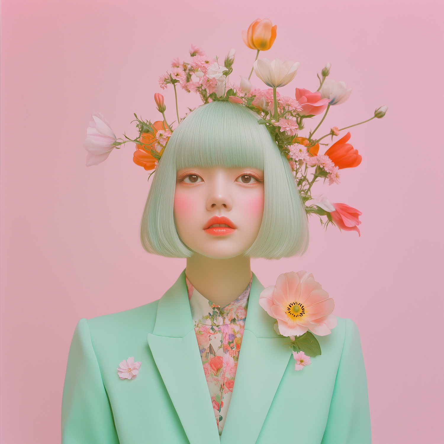 Ethereal portrait of a woman with mint-green hair, floral crown, and pastel blazer against a soft pink background.