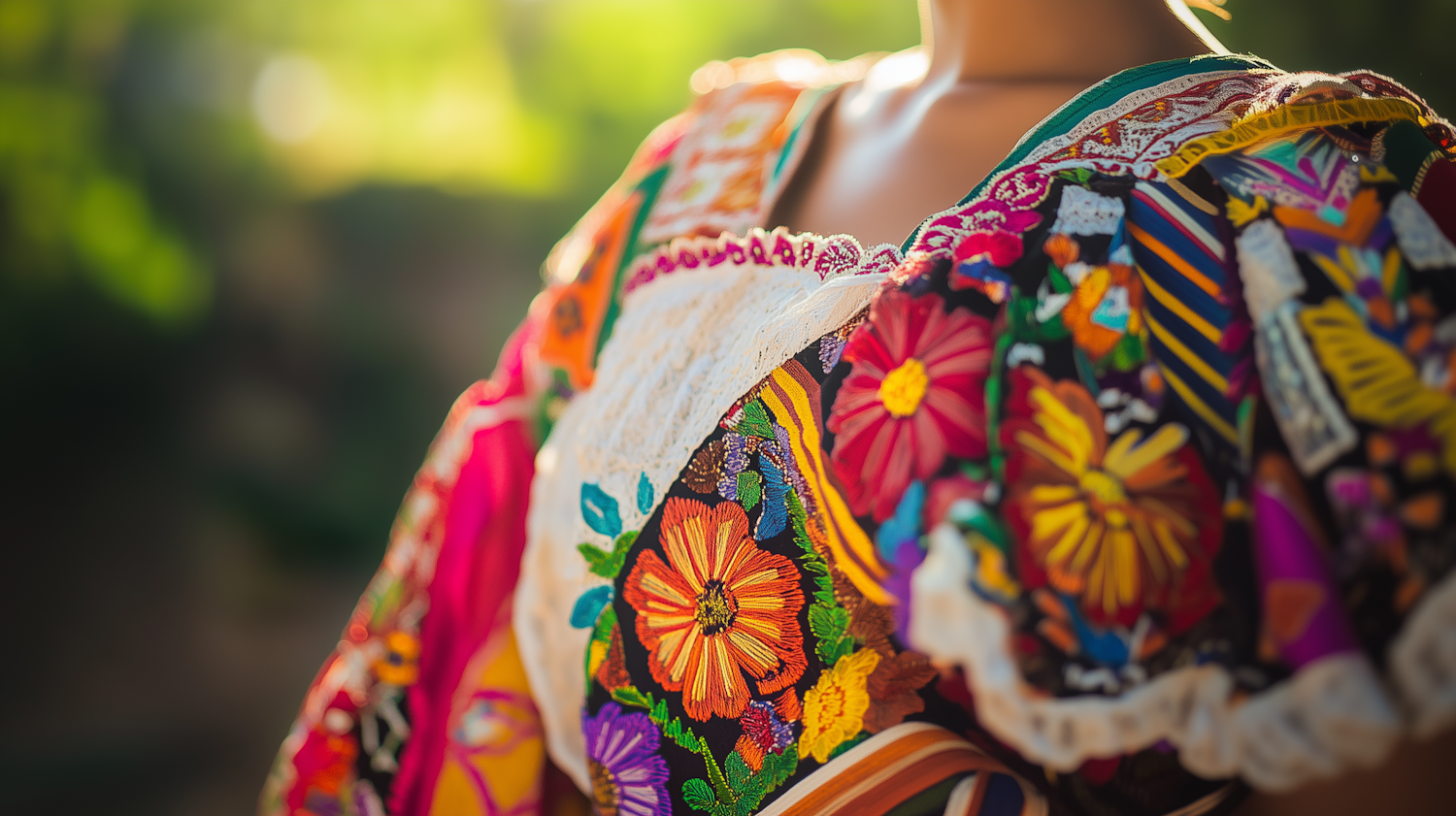 Close-up of a colorful traditional garment with intricate floral embroidery and lace details, illuminated by soft natural light outdoors.