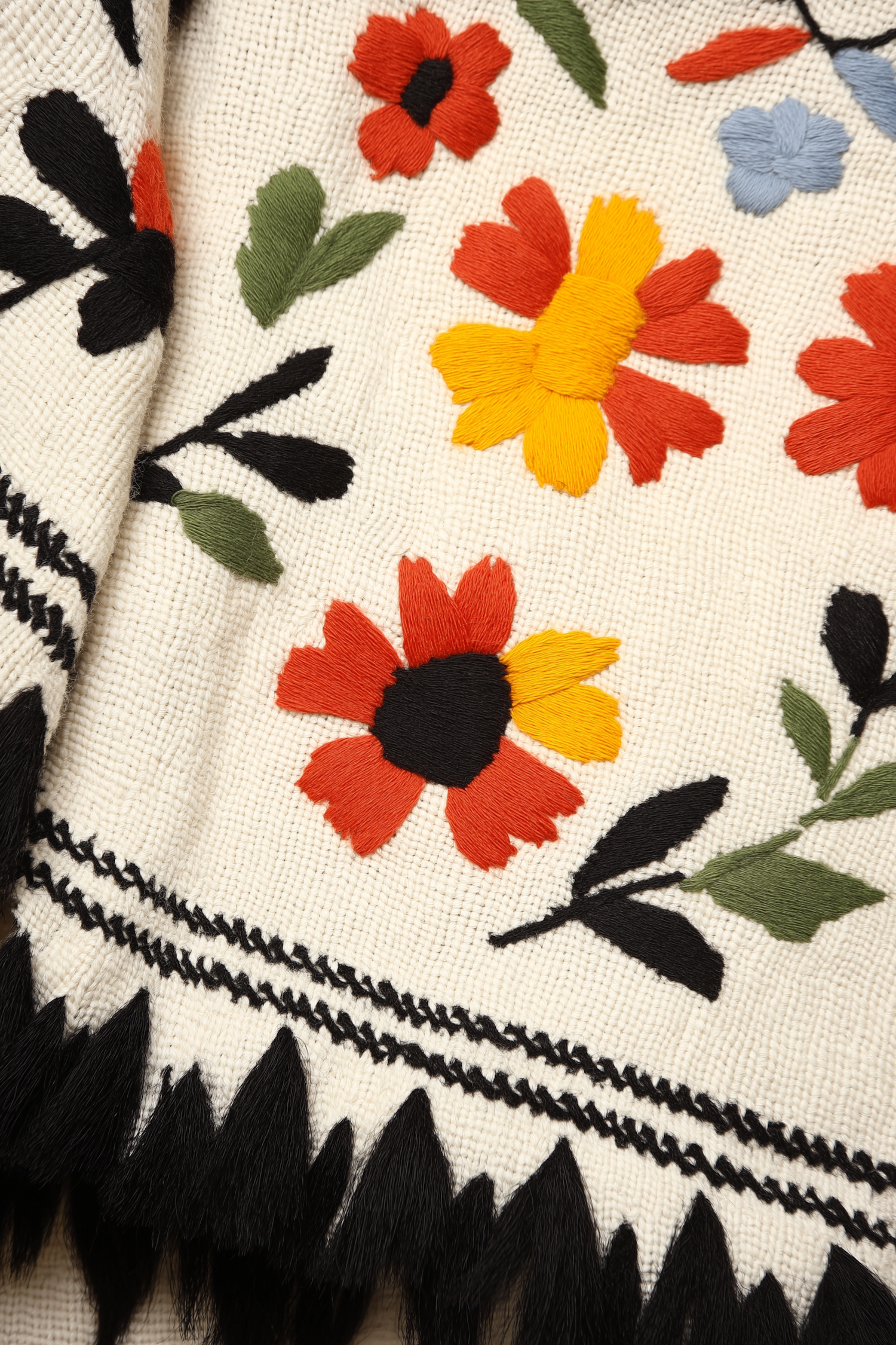 Close-up of a cream textile with vibrant floral embroidery, black fringe, and decorative stitching. Perfect for traditional or artisanal decor.