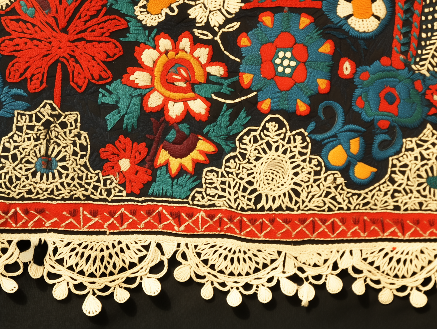 Intricate floral embroidery in vibrant colors paired with elegant white lacework on a black textile background.