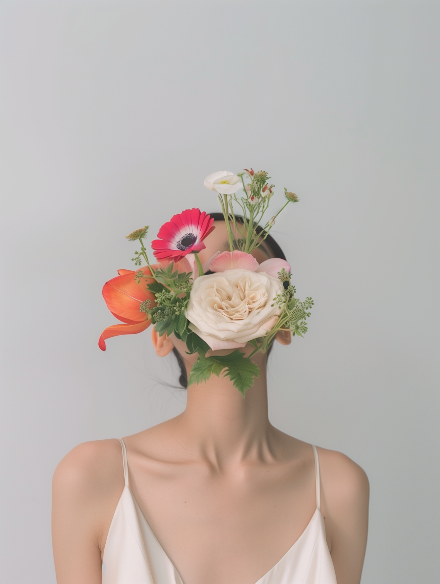 A surreal portrait of a person with their face replaced by a vibrant floral arrangement, featuring roses, daisies, and lilies.