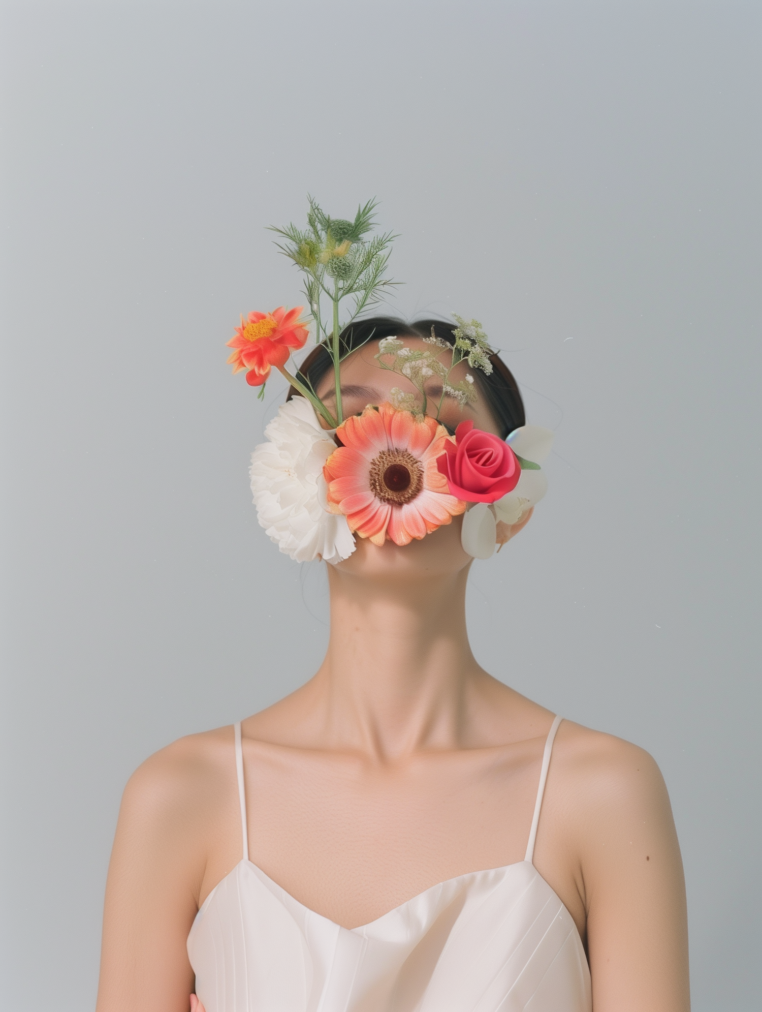 A woman in a white dress with her face obscured by vibrant flowers, creating a surreal and artistic vibe against a neutral gray background.