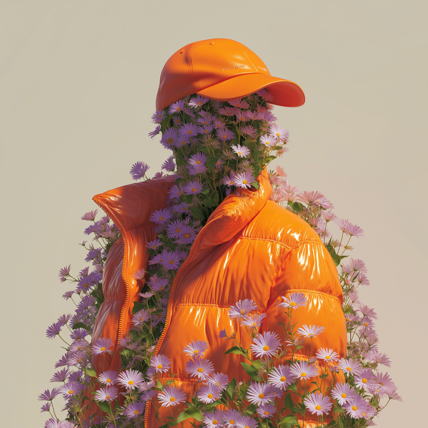 A surreal figure made of flowers and foliage, wearing an orange jacket and cap, blending nature and fashion in a creative composition.