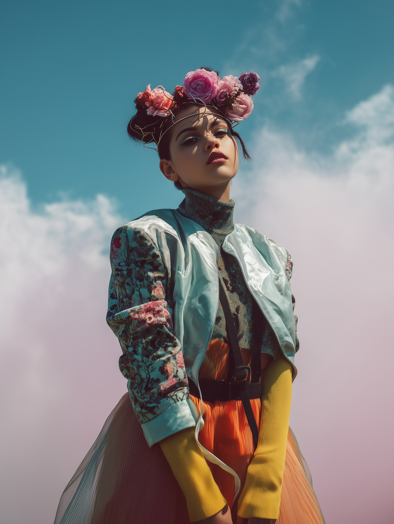 Stylish woman in a floral crown and vibrant outfit poses against a dreamy blue sky with clouds, blending fashion and nature.