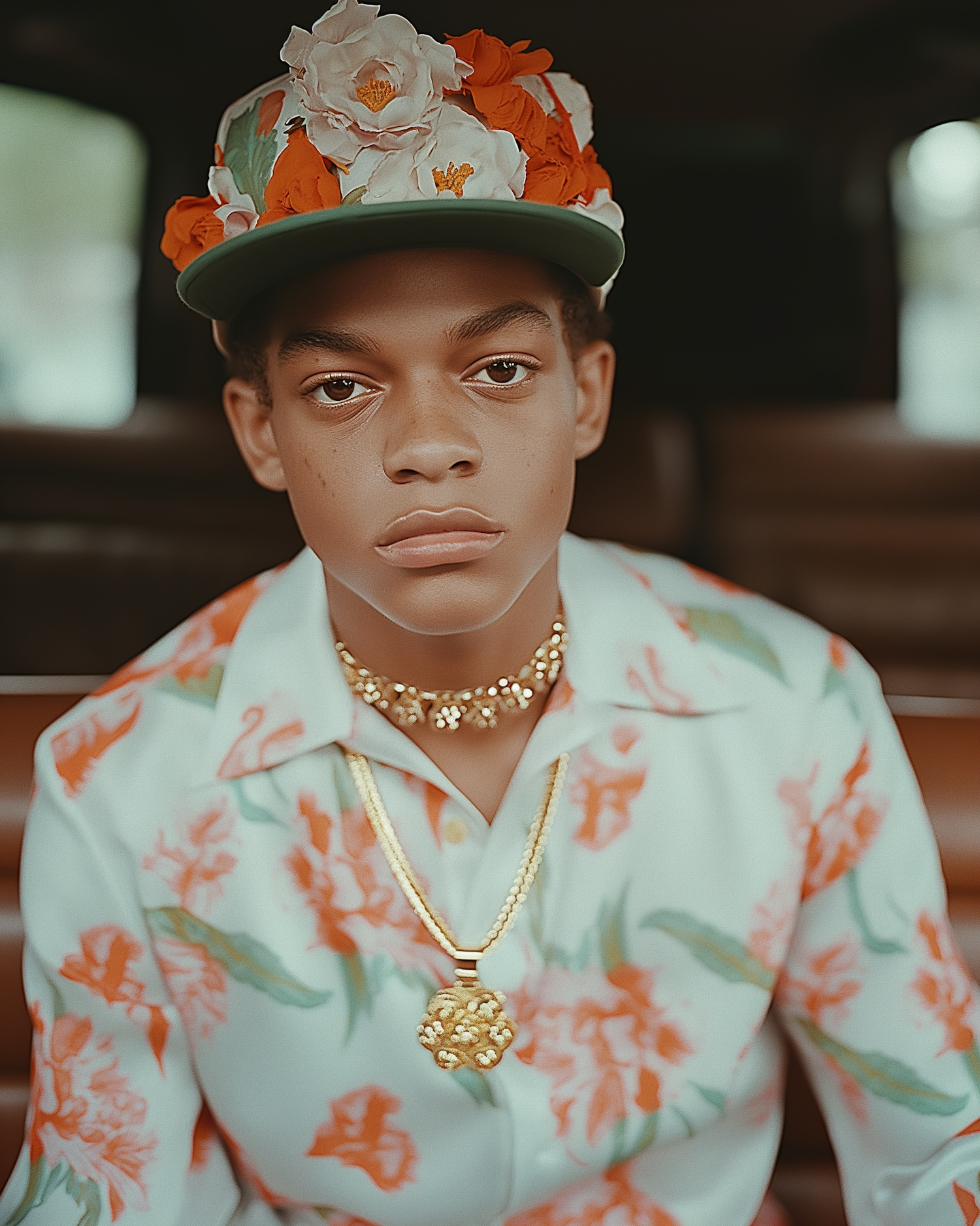 Young man in floral shirt and cap with gold necklaces, sitting in a vehicle, gazing directly at the camera.