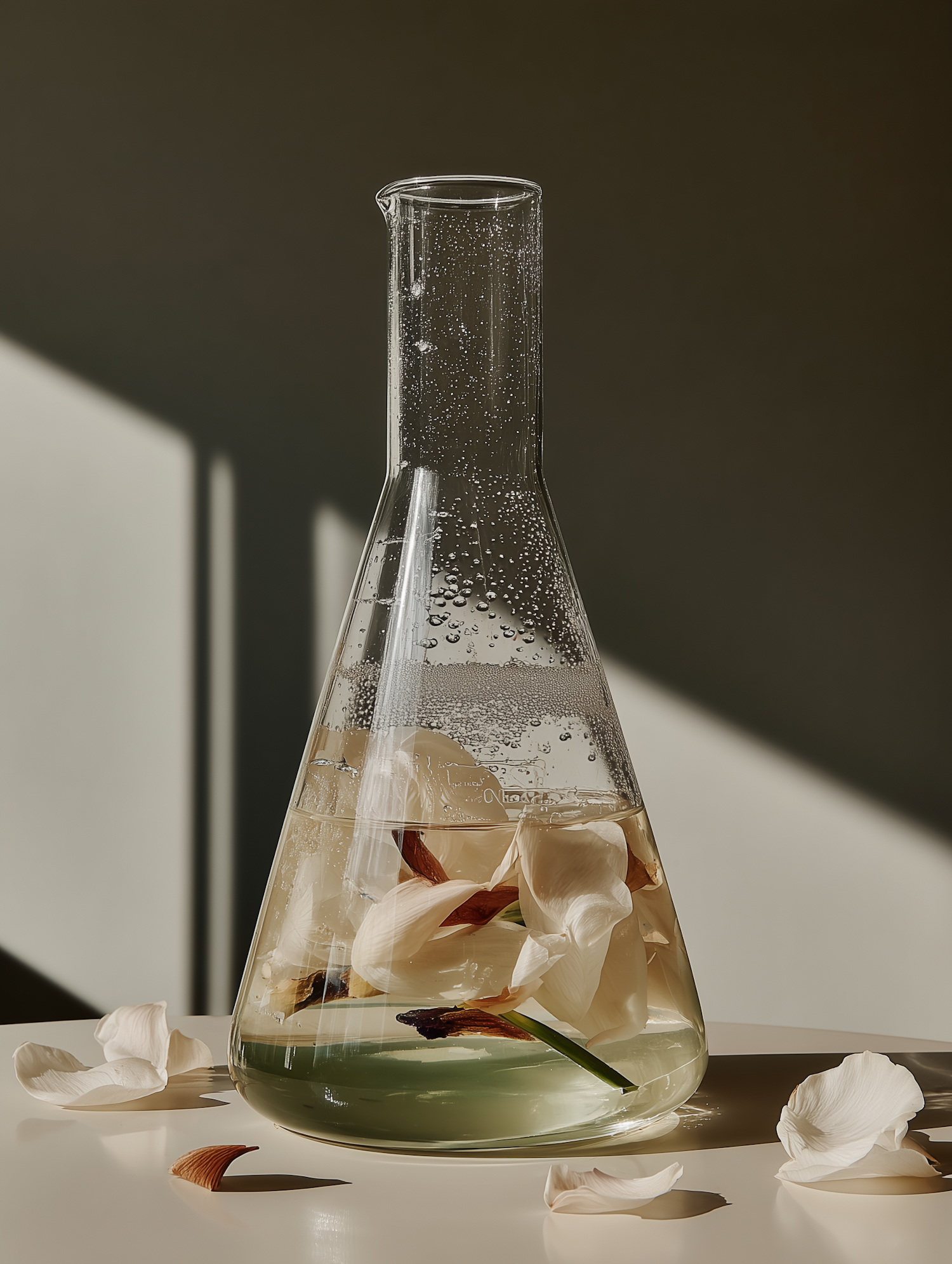 A glass flask with water and white flower petals inside, placed on a white surface with soft lighting and scattered petals around.