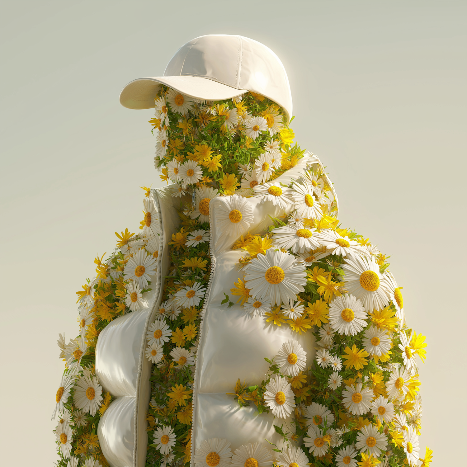 A surreal figure adorned with daisies and yellow flowers, wearing a white puffer jacket and cap, blending nature and fashion in a unique way.