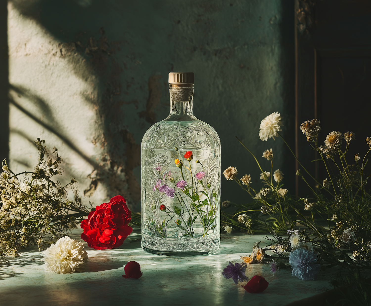 Elegant glass bottle with colorful flowers inside, surrounded by scattered blooms in soft natural light against a rustic background.