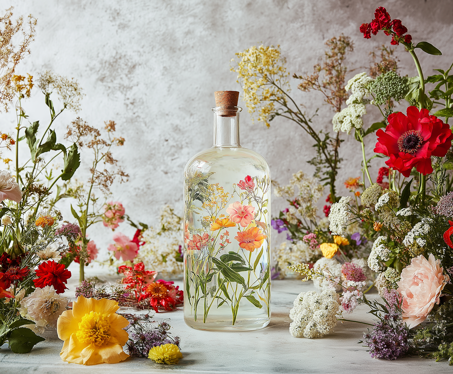 A beautifully designed floral bottle surrounded by vibrant flowers on a textured background, creating a harmonious and colorful scene.