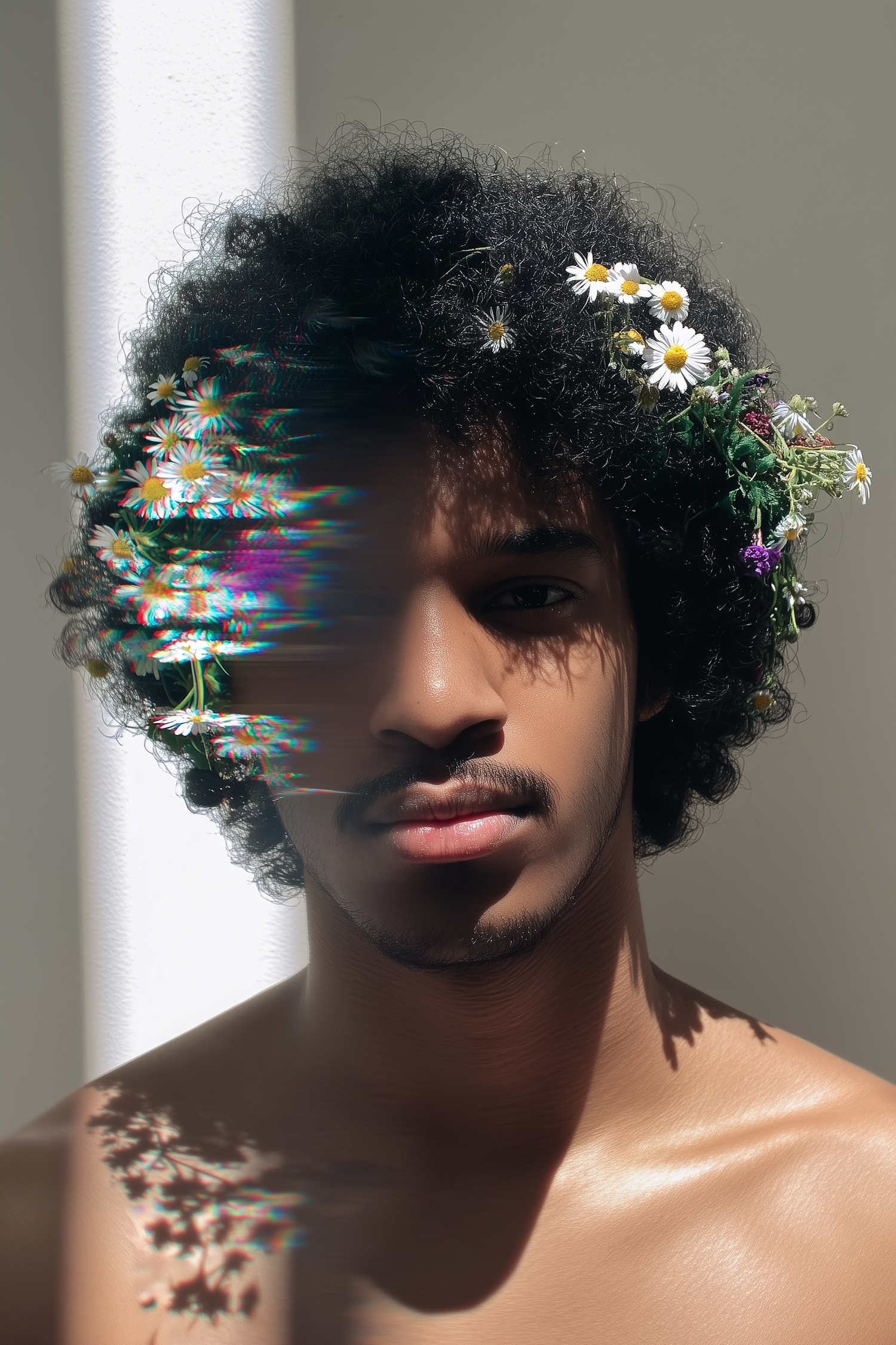 Close-up portrait of a person with curly hair decorated with flowers, highlighting a sunny ambiance and creative lighting effects.