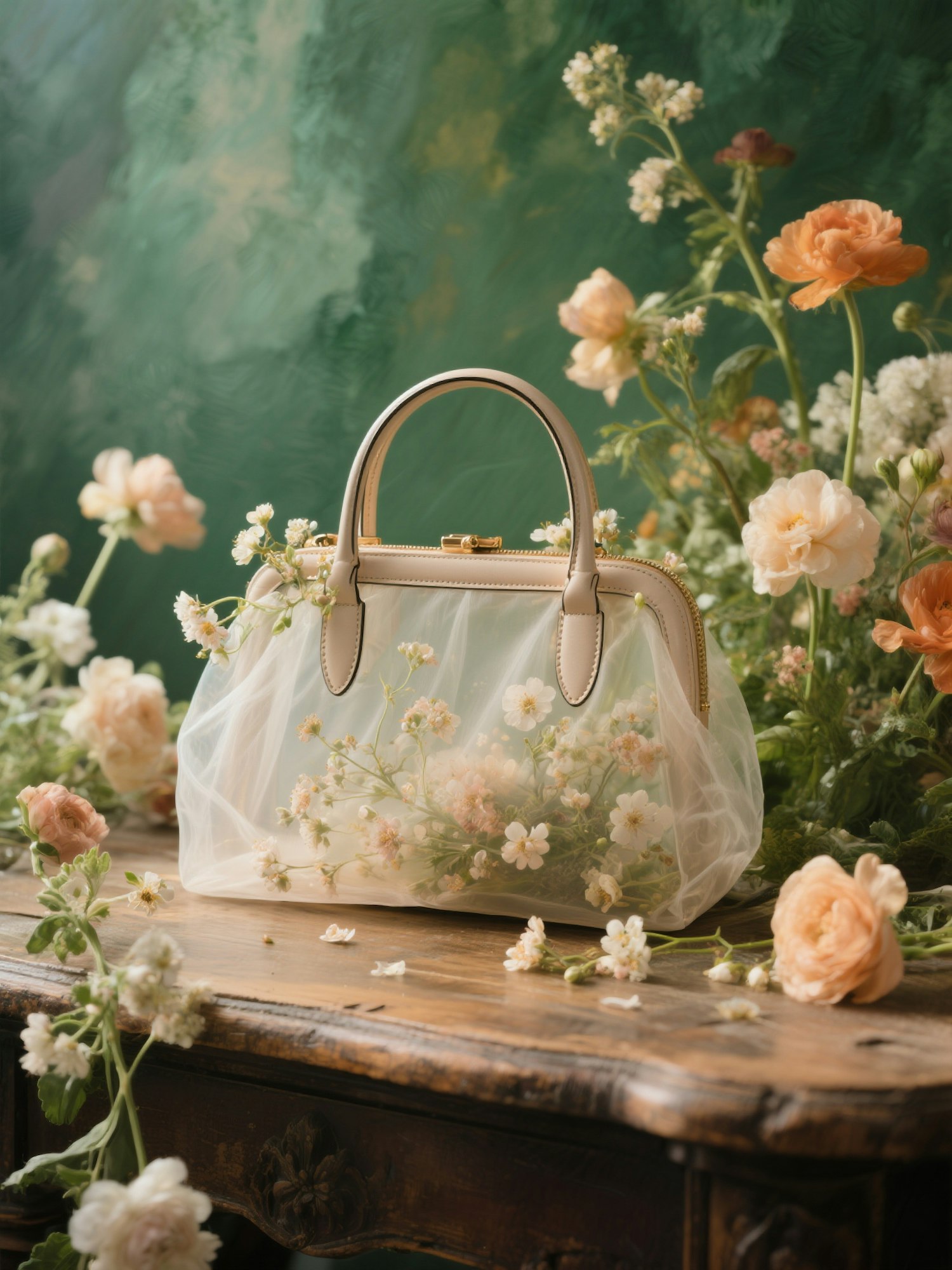 studio product photography of a handbag staged like a luxury fashion campaign, elegant floral composition, soft natural lighting, vintage still life setup, warm tones, flowers coming out of or surrounding the bag, green textured background, editorial style, 50mm lens, medium shot + a translucent organza-style bag with small blossoms inside, displayed like a still life painting
