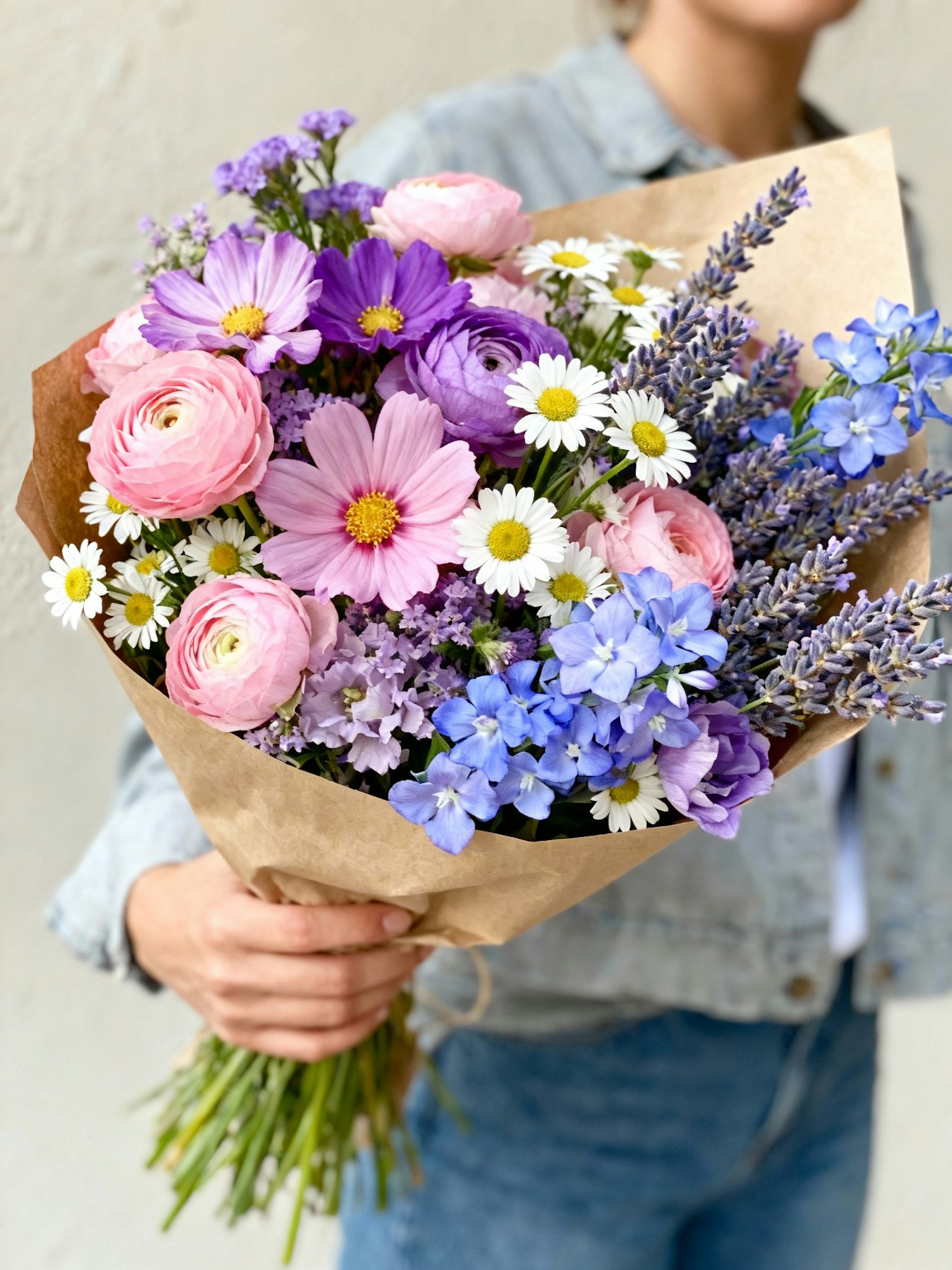 Vibrant bold aesthetic photograph, natural lifestyle style, soft daylight, candid framing, rich textures, colorful flower bouquets, not staged, influencer style photography, high quality realistic details — A hand holding a large pastel bouquet with ranunculus, cosmos, daisies, lavender and periwinkle flowers, vibrant pinks, purples and blues, wrapped in kraft paper, casual outfit in background, soft wall backdrop