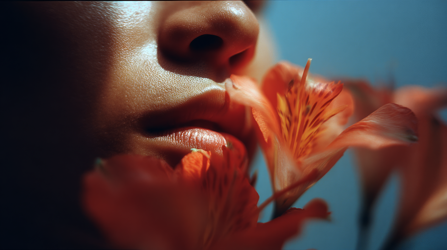 Close-up of lips and nose with vibrant orange flowers, highlighting skin texture and floral details in soft lighting.
