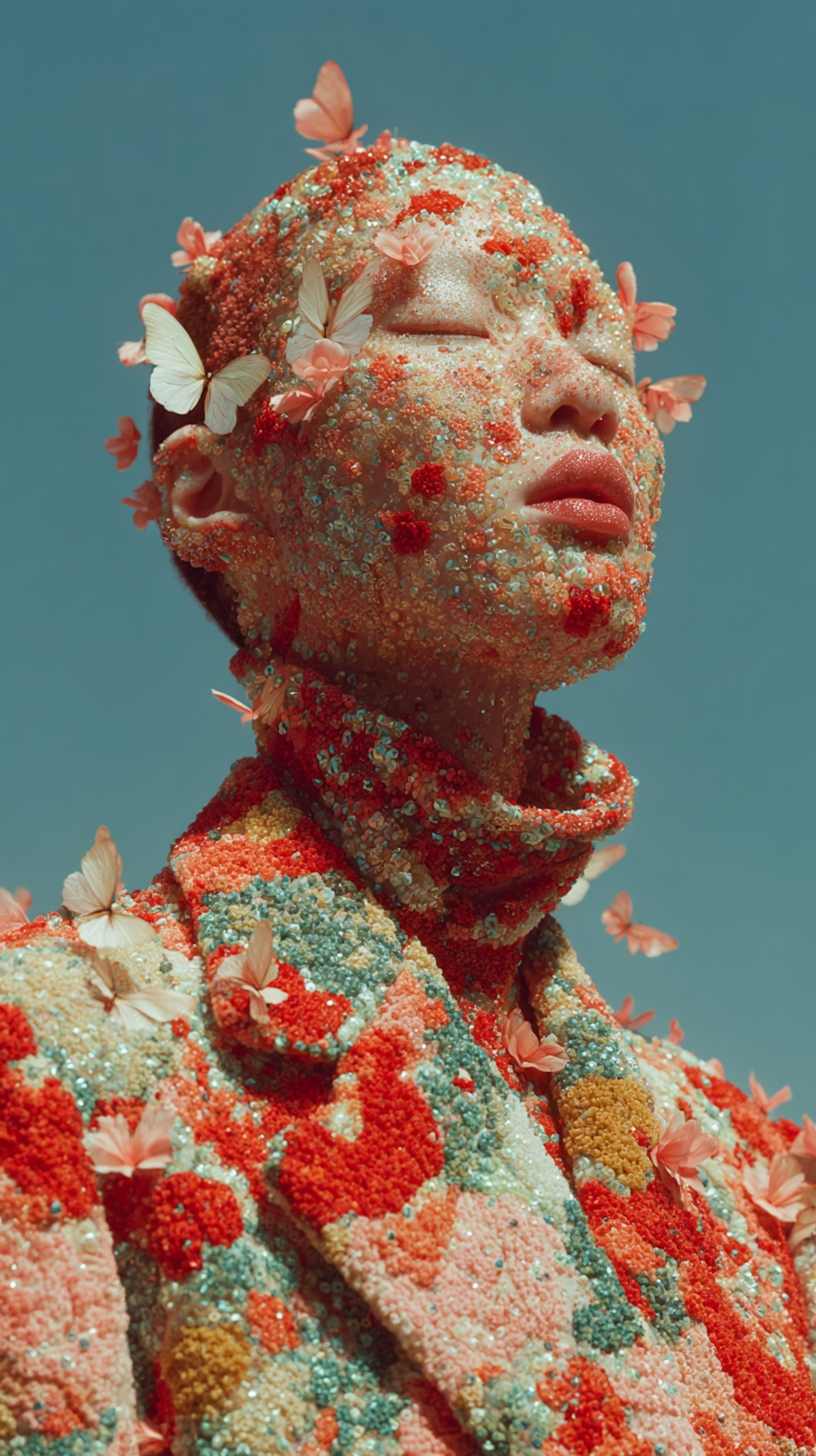 A serene individual adorned with vibrant floral and butterfly embellishments against a clear blue sky, creating a striking artistic composition.