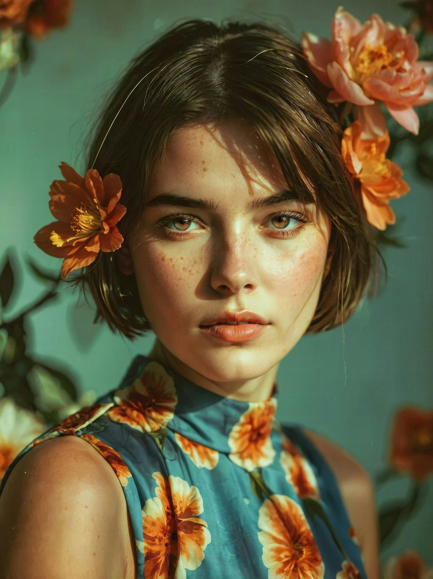 Portrait of a young woman with orange flowers in her hair, wearing a floral dress. Striking green eyes and serene expression.