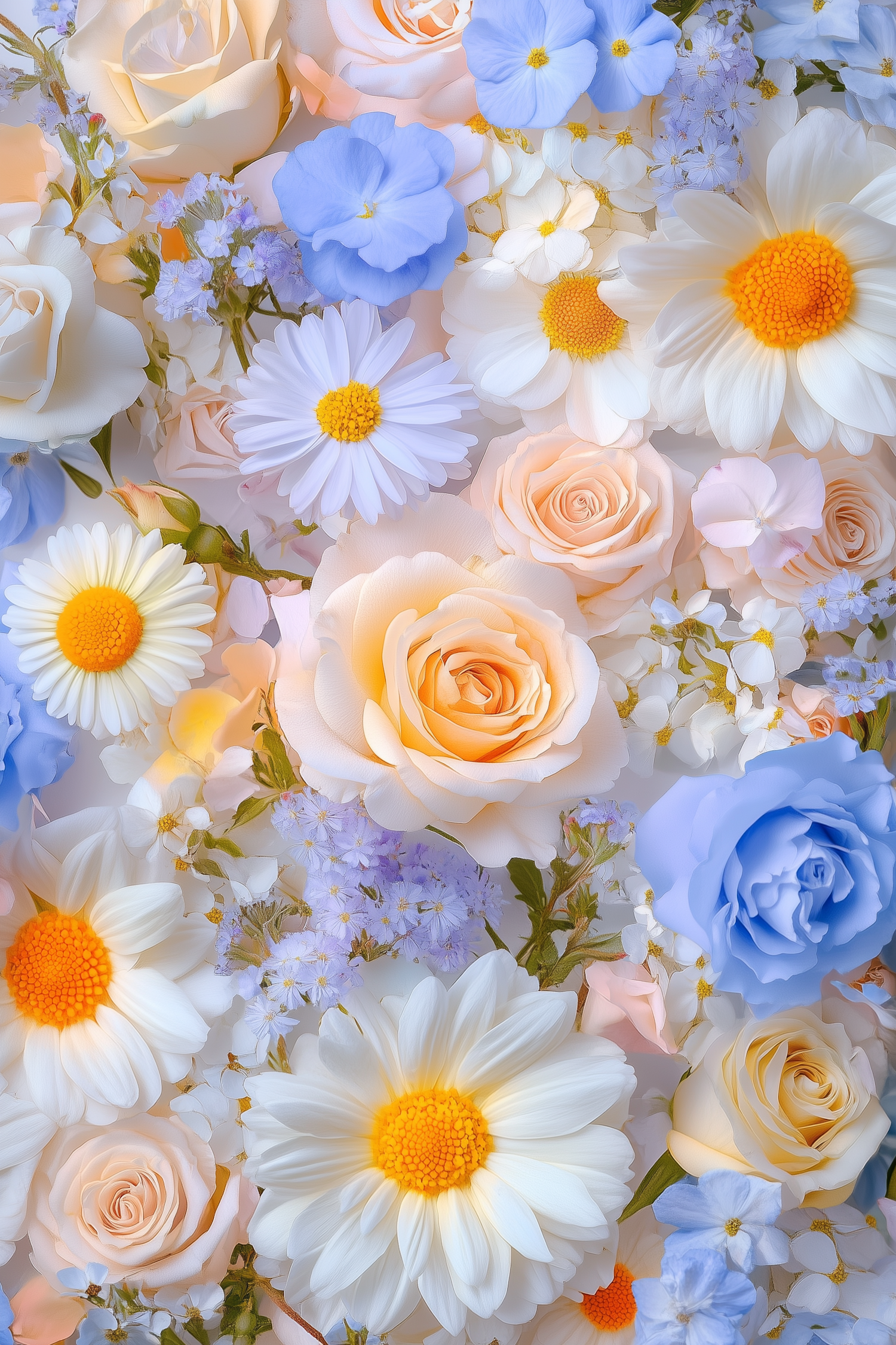 A beautiful floral arrangement with white daisies, peach roses, and blue flowers in soft pastel colors.