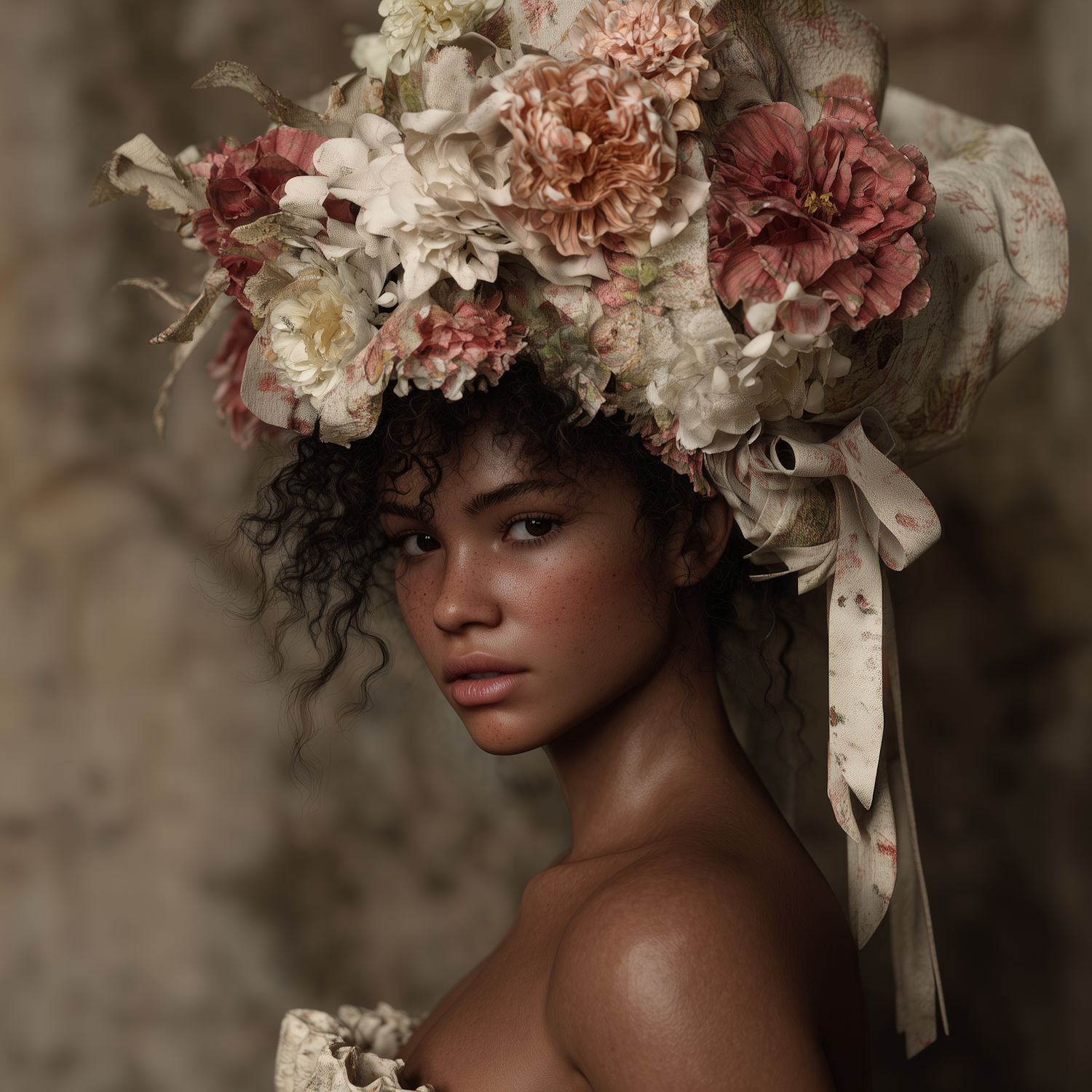 A woman with a floral headdress and vintage attire poses against a textured background, exuding elegance and artistic charm.