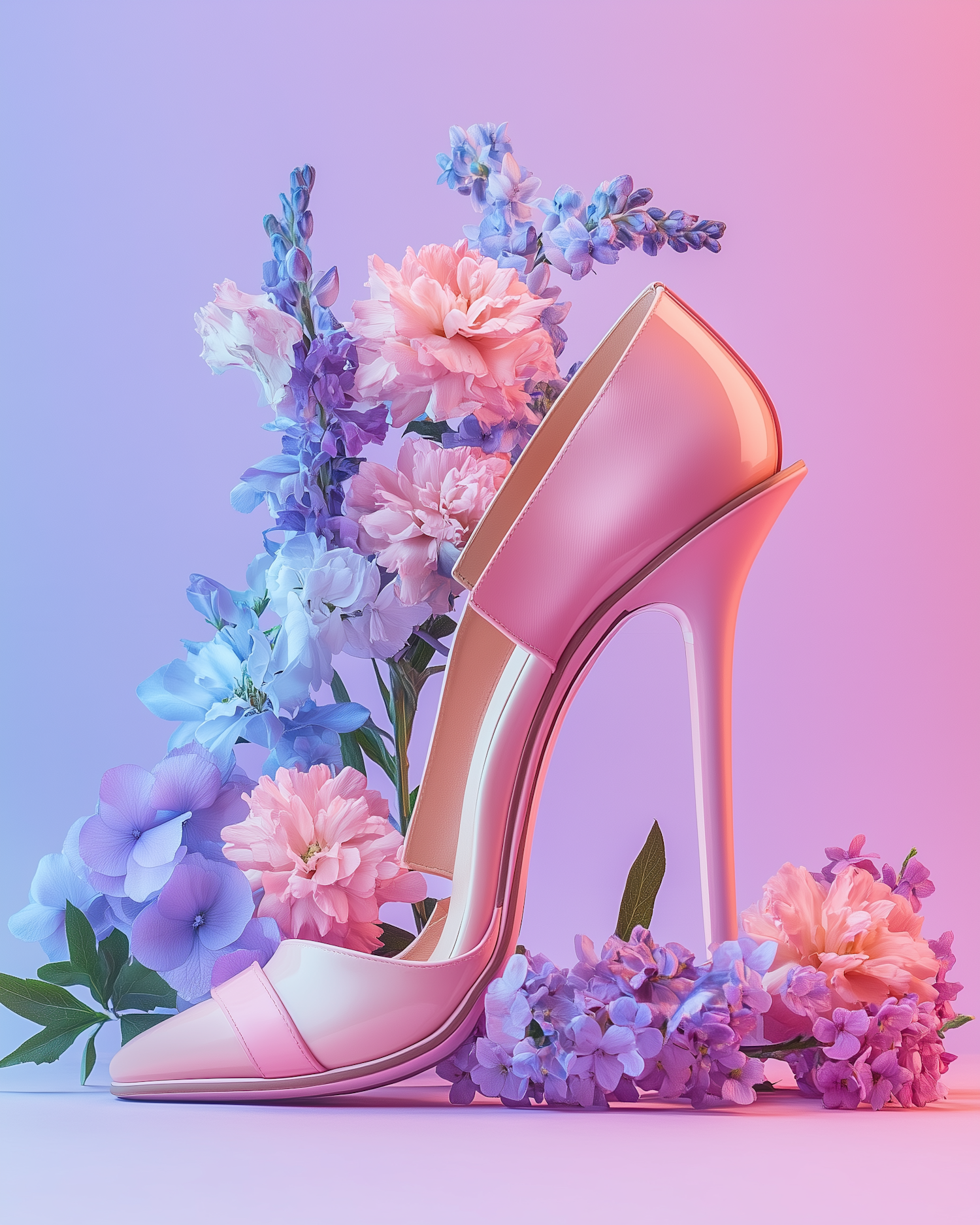 Elegant pink high heel surrounded by vibrant pink, purple, and blue flowers on a soft gradient background.