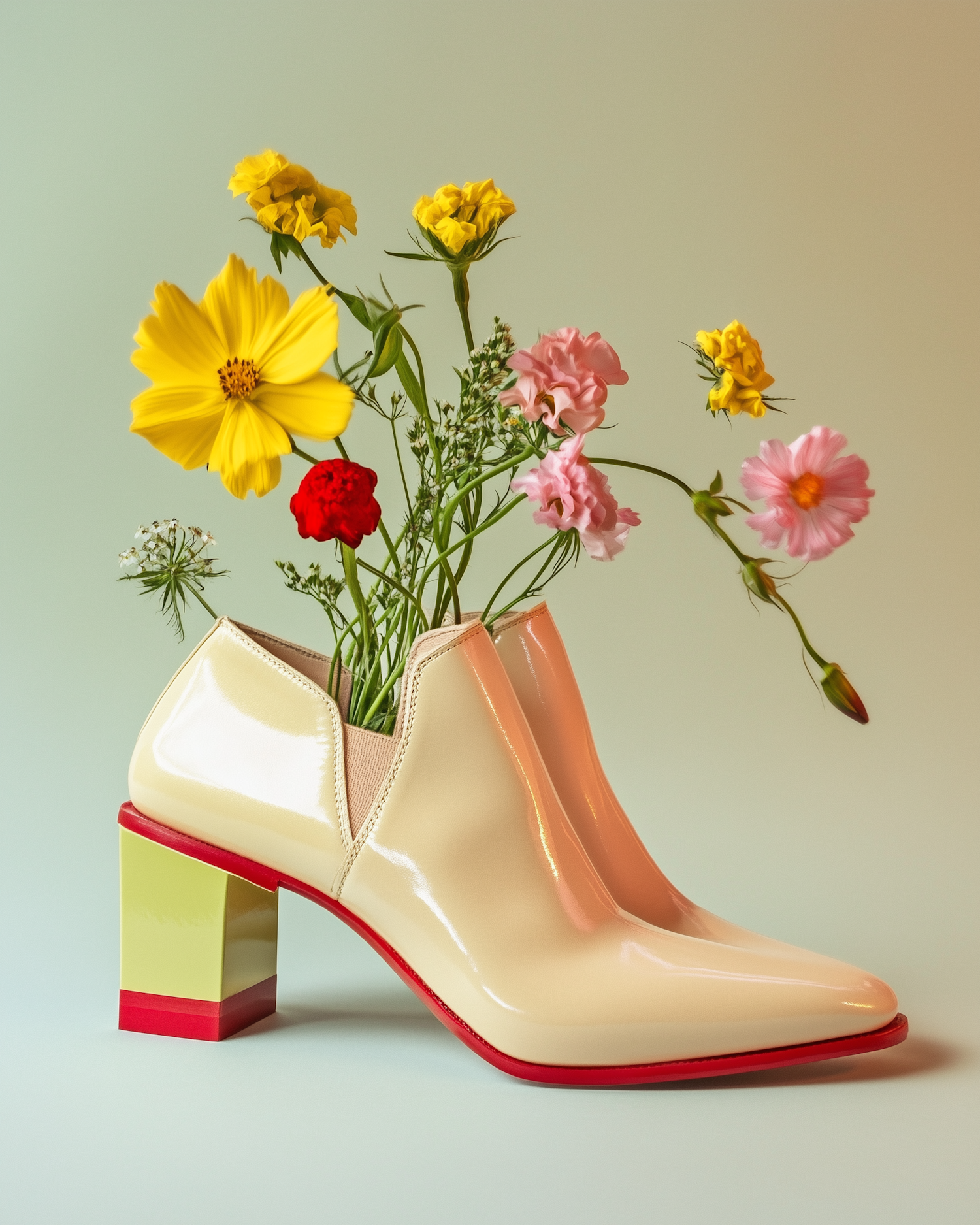 Glossy cream heels with colorful block heels, adorned with vibrant flowers against a soft green background. Fashion meets nature.