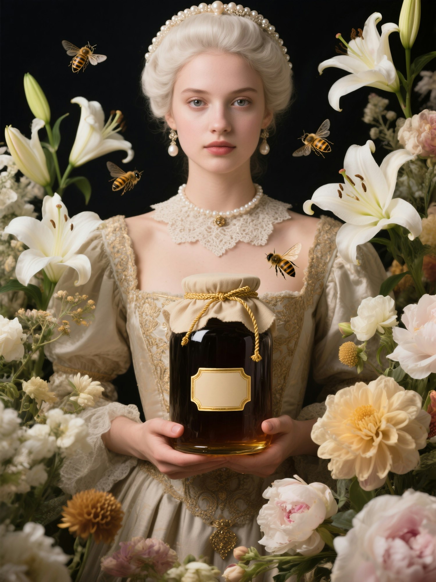 Studio photography with a chic, royal and elegant art direction. High contrast lighting, refined and sophisticated atmosphere, not overly bright, luxurious visual style. A close-up portrait of a beautiful young woman in a royal Versailles gown with lace collar and a powdered wig adorned with pearls. She holds a dark glass honey jar of realistic size in her hands, positioned carefully at chest level, as if it were a precious jewel. The jar has a beige fabric-covered lid tied with a golden string, and a blank rectangular label in golden beige with a golden border. Behind and around her, an abundance of lilies, dahlias and peonies fills the entire background, framing her face and shoulders. Bees fly delicately near the jar and flowers, adding movement to the scene. The mood is regal, dramatic, and chic, with a strong editorial aesthetic