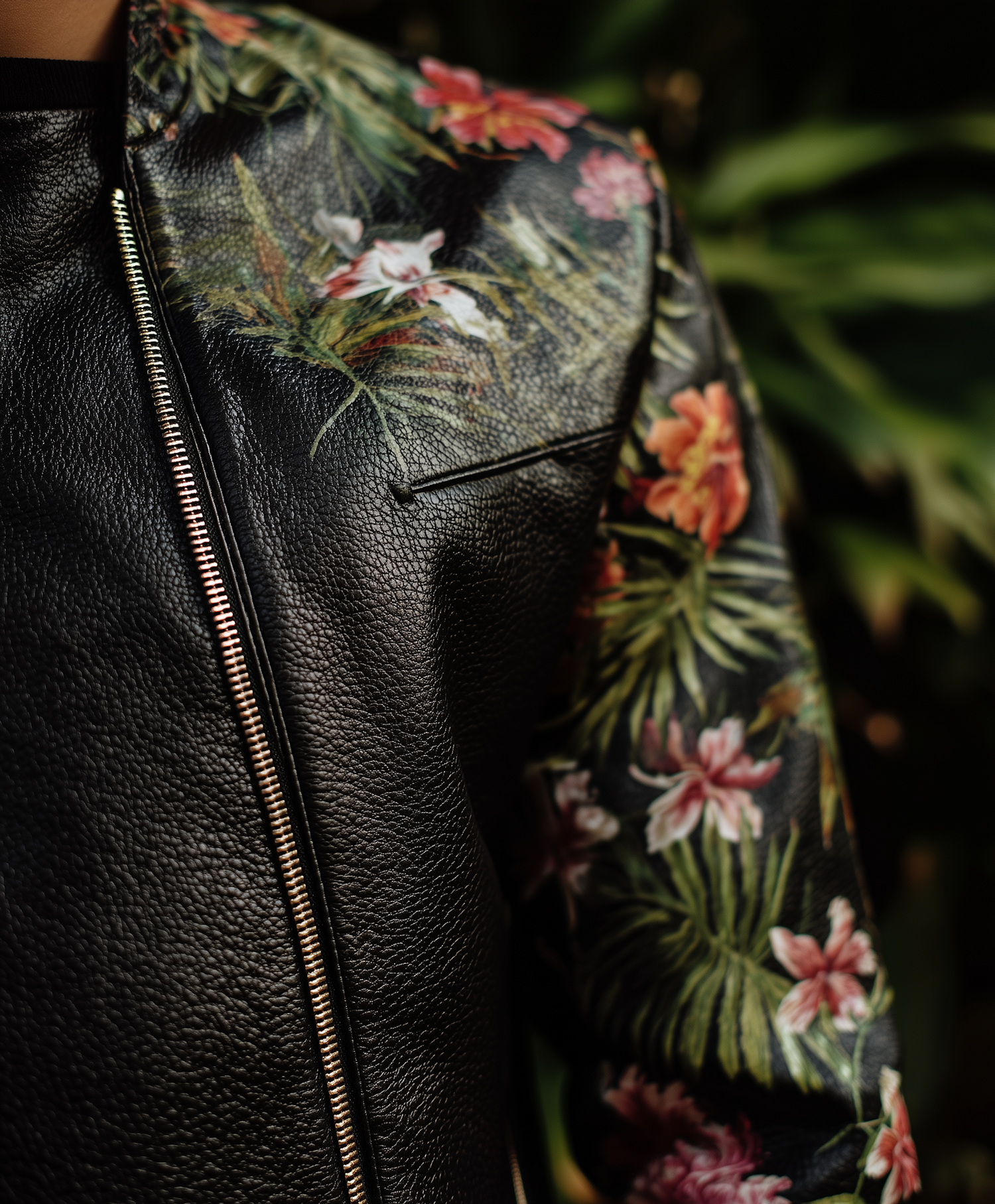 Close-up of a black leather jacket with vibrant floral sleeves and a metallic zipper, set against a blurred green foliage background.