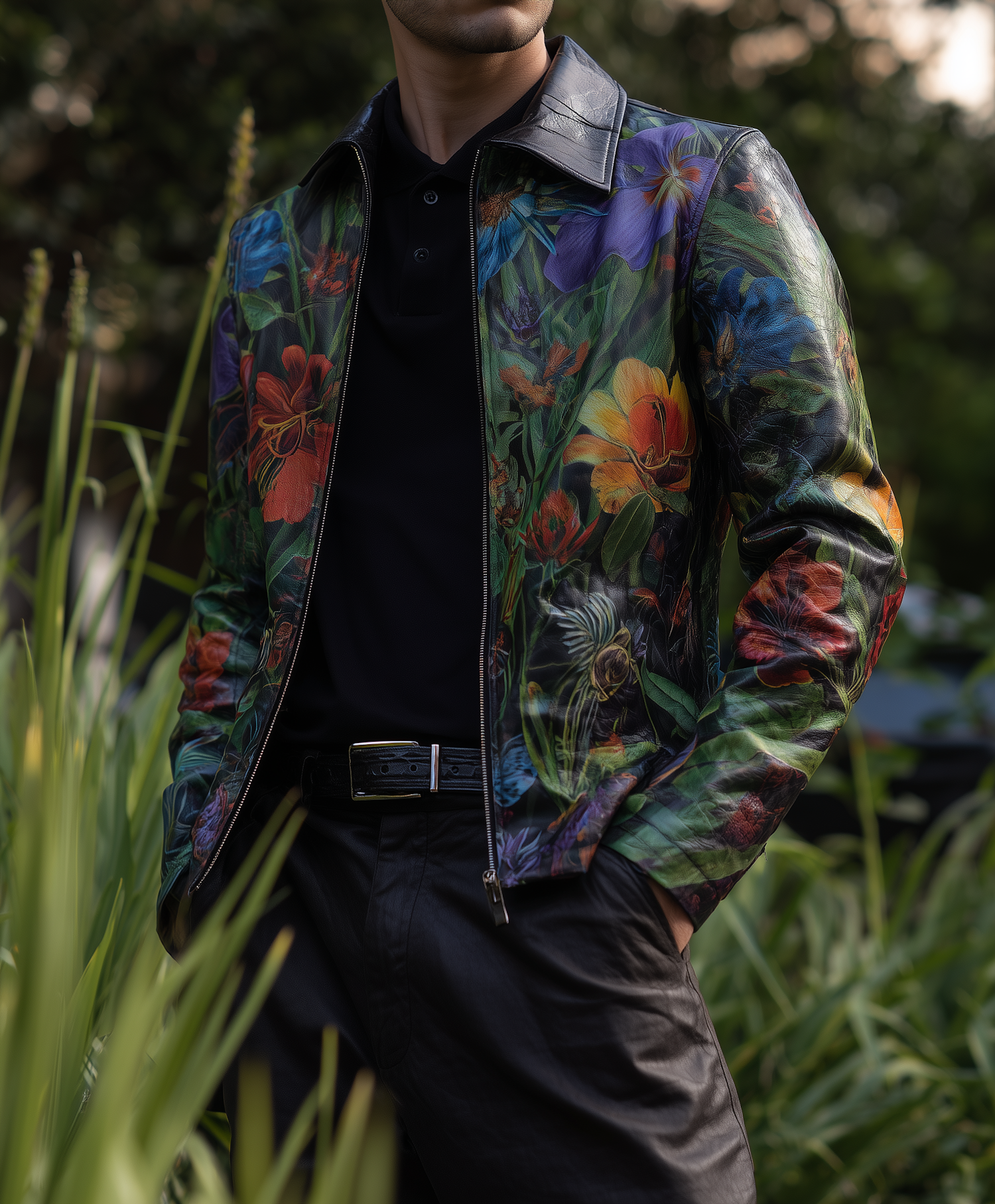 A stylish leather jacket with a vivid floral design paired with black attire, set against a lush green outdoor background.