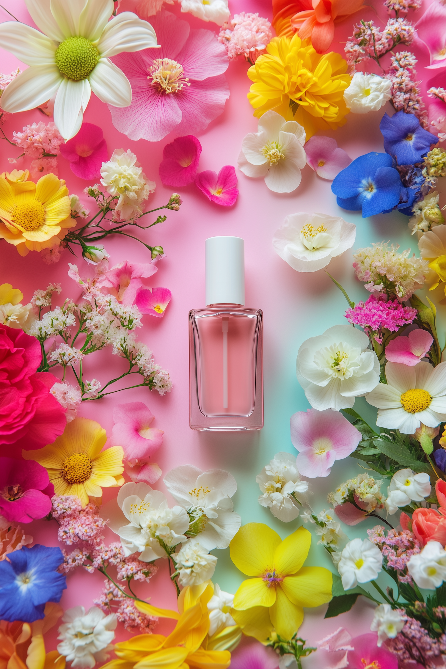 A sleek pink perfume bottle surrounded by vibrant flowers on a pastel gradient background, perfect for springtime vibes.