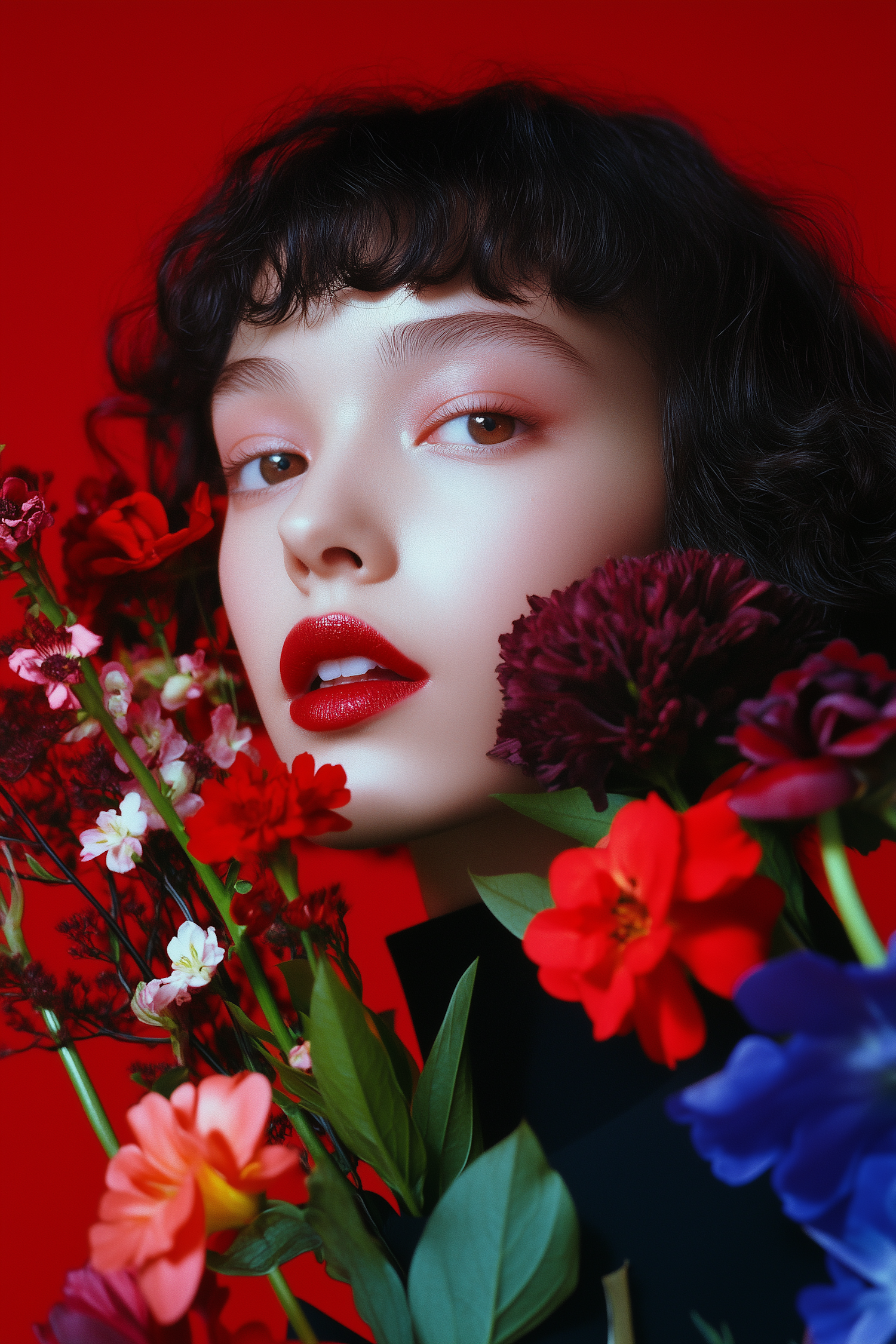 Bold portrait of a woman with glossy red lips, surrounded by vibrant flowers against a vivid red background. Striking and artistic.