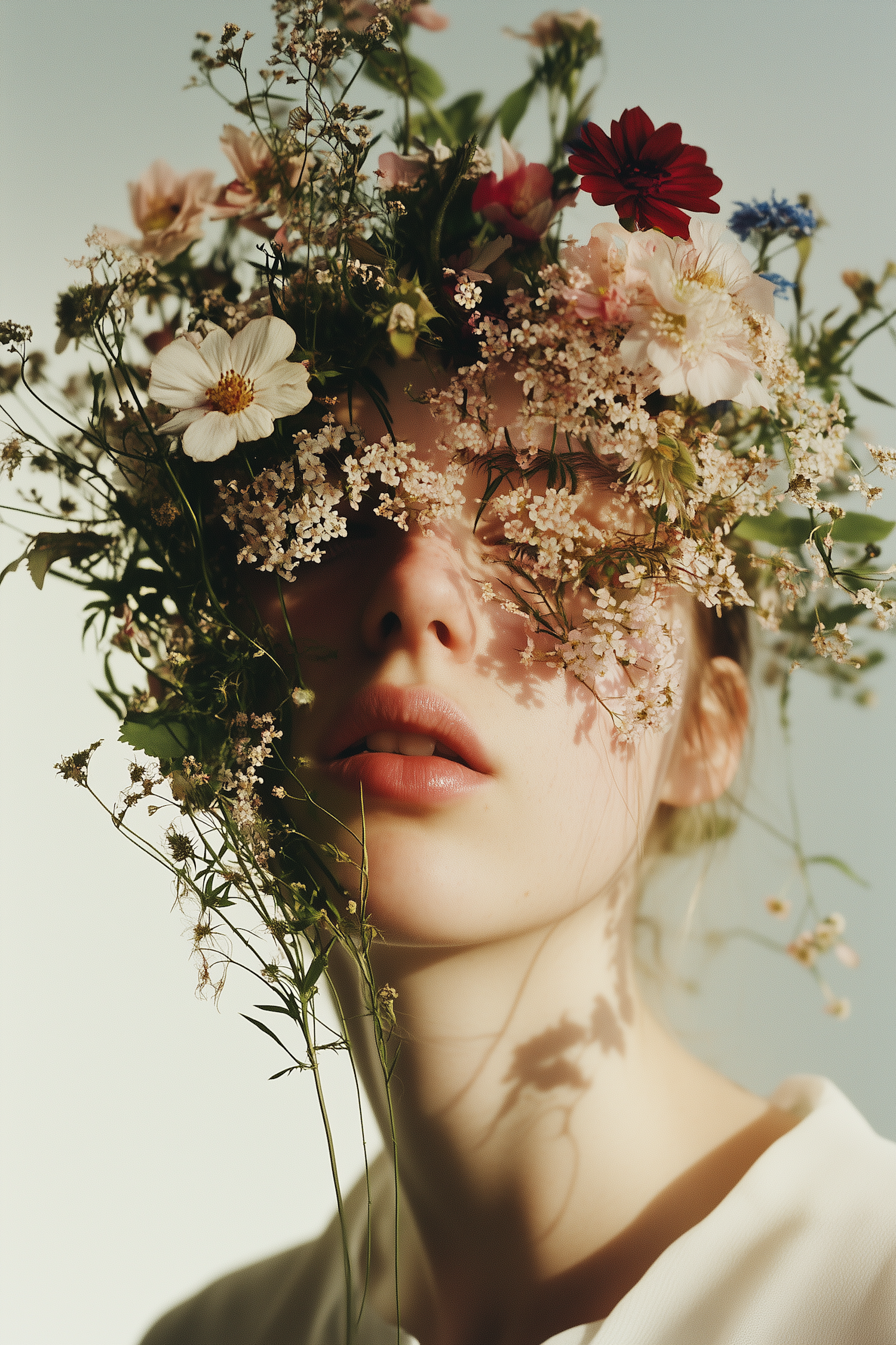 Artistic portrait of a woman with wildflowers cascading over her face, creating a serene and ethereal vibe with soft lighting.