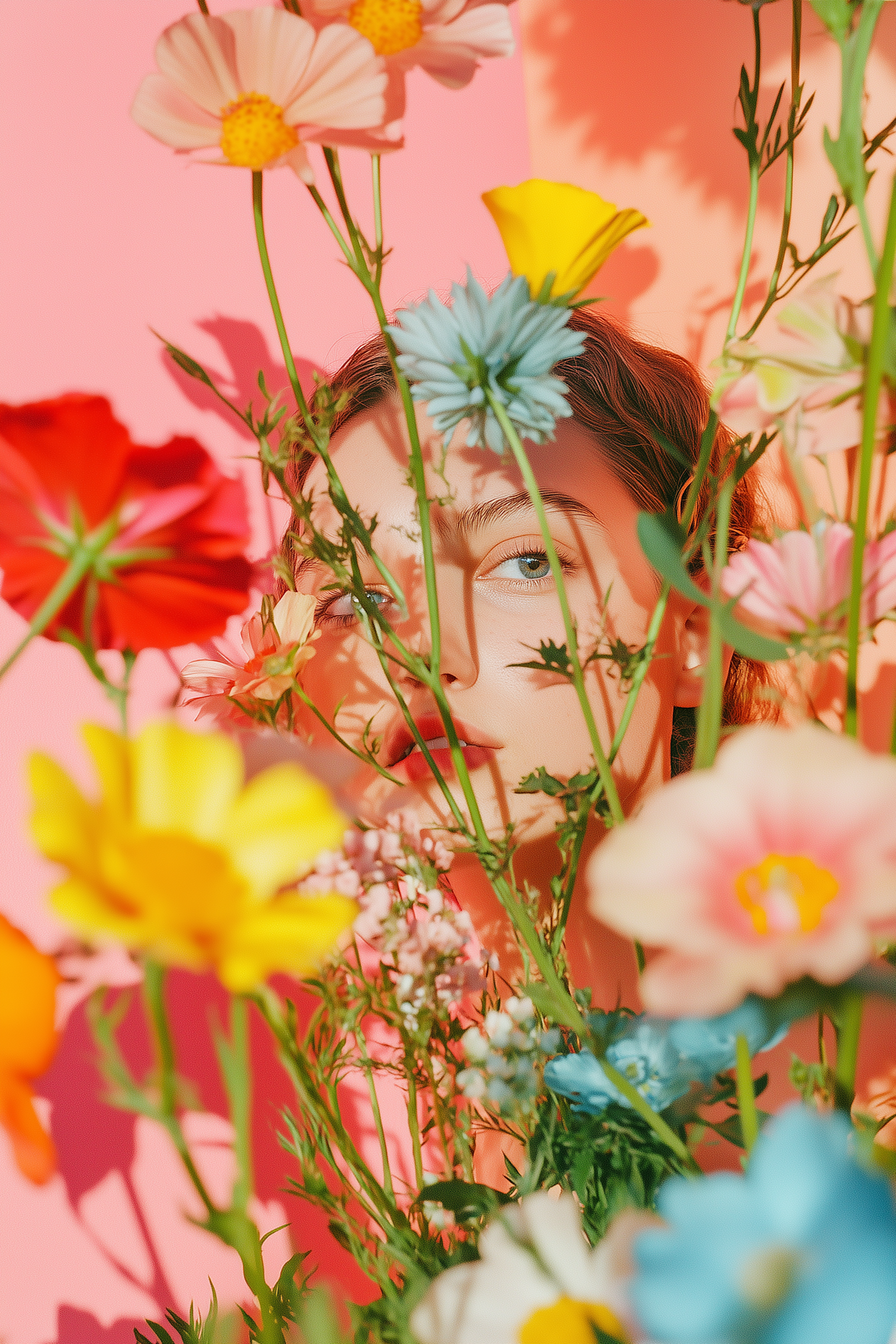 A vibrant portrait of a woman surrounded by colorful flowers against a bright pink background, blending nature and art in a stunning composition.