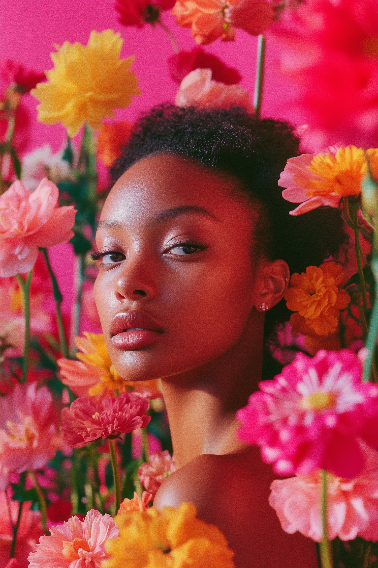A stunning portrait of a woman surrounded by vibrant flowers in pink, yellow, and orange hues, set against a bold pink background.