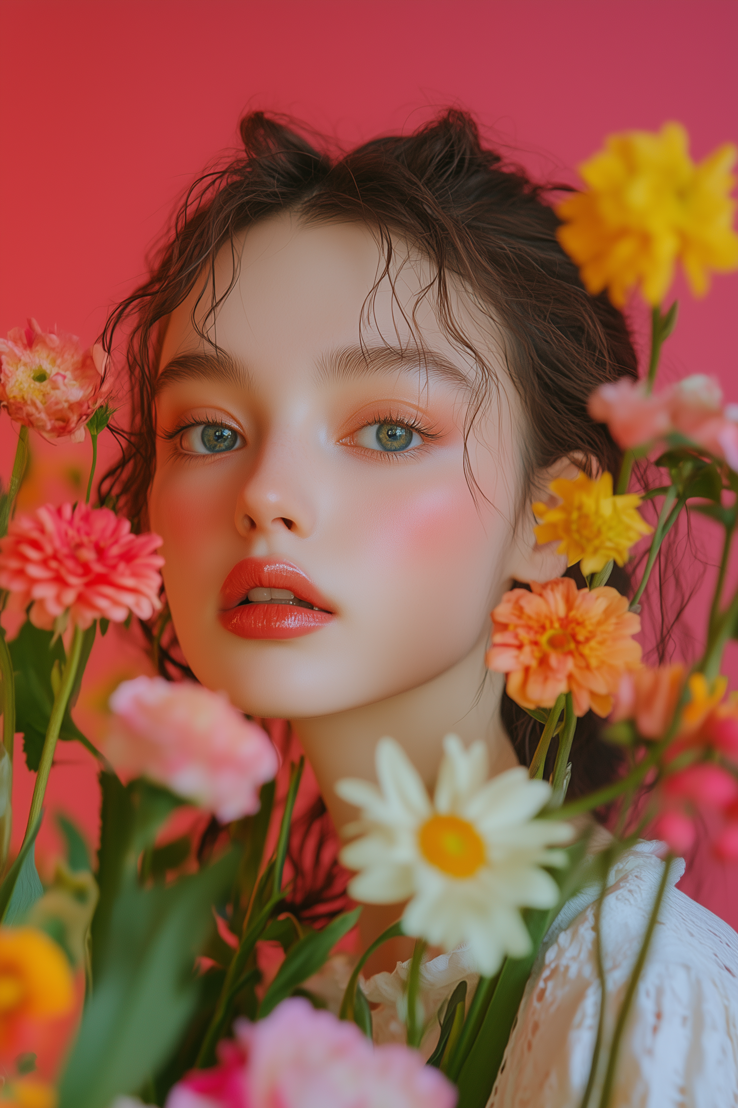 A dreamy portrait of a young woman with green eyes, glossy red lips, and vibrant flowers against a bold pink background.