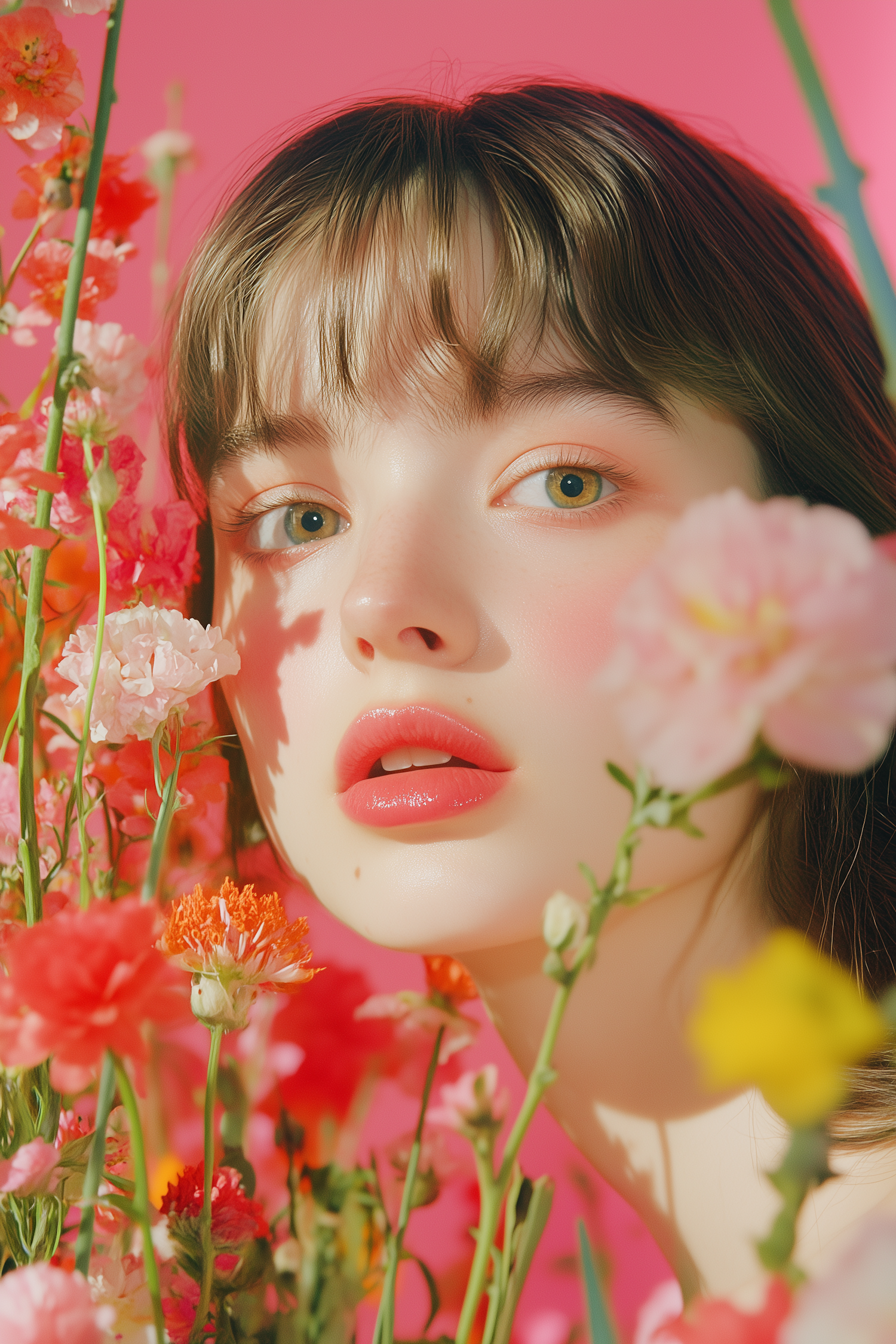 A vibrant close-up of a young woman surrounded by colorful flowers, with soft lighting and a pink background creating a cheerful vibe.