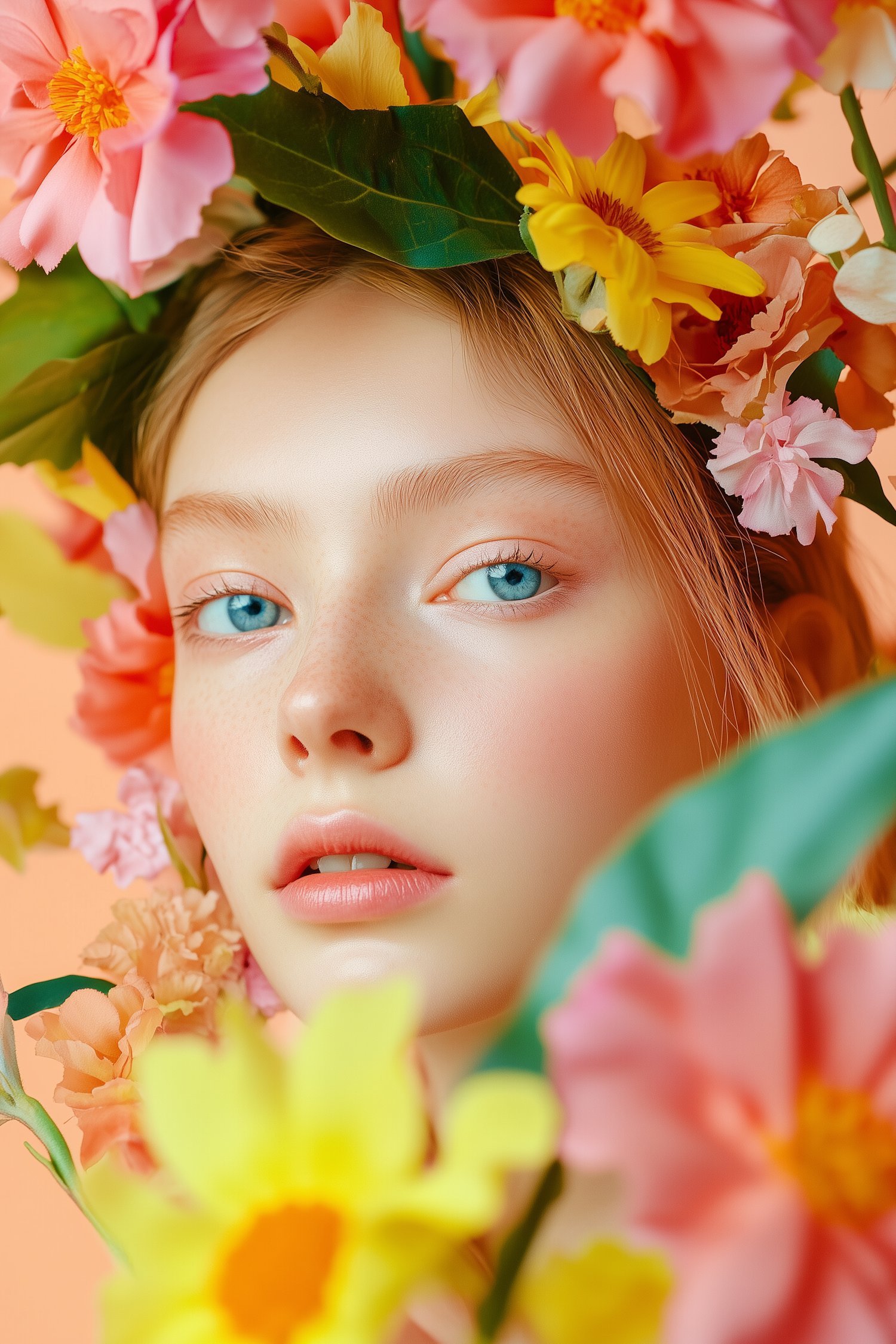 Close-up of a young woman with blue eyes and freckles surrounded by vibrant flowers, set against a soft peach background.