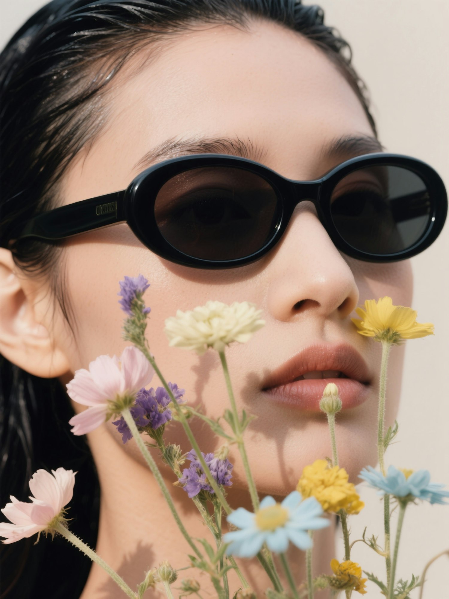 Close-up of a person in black oval sunglasses with colorful flowers in the foreground, creating a vibrant and artistic composition.