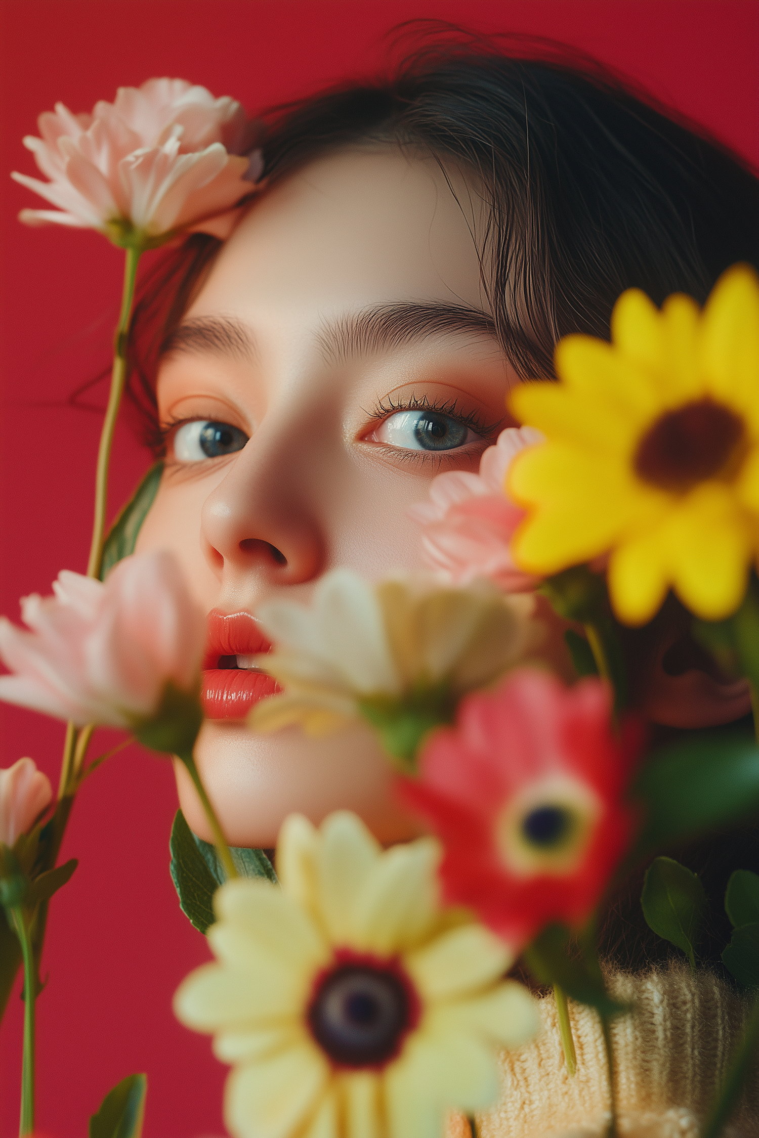 Close-up of a woman with blue eyes surrounded by colorful flowers against a bold red background, creating a vibrant and artistic portrait.