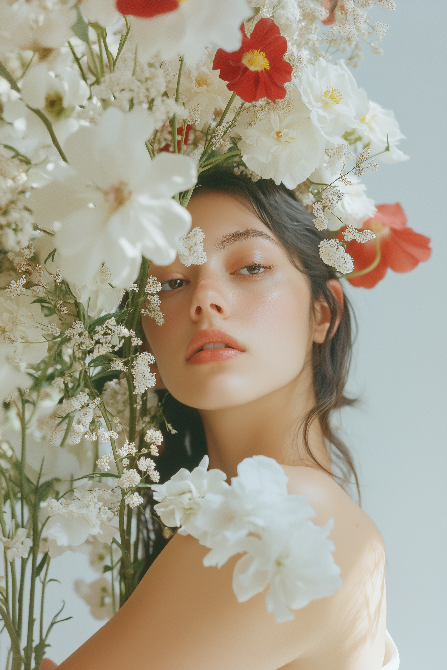 A serene portrait of a woman surrounded by white and red flowers, creating a dreamy and natural aesthetic with soft, delicate tones.