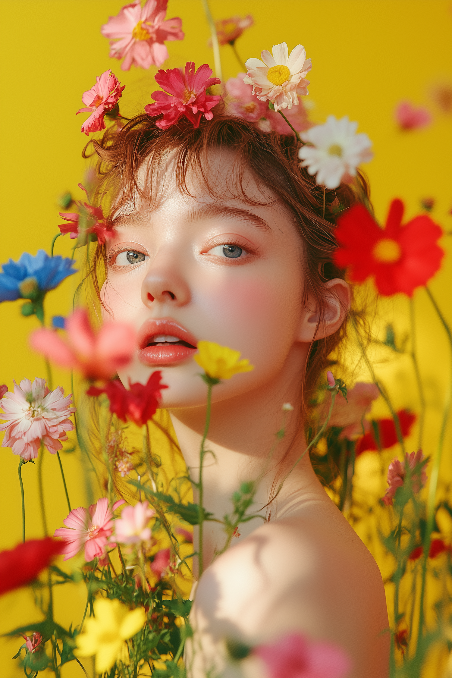 A dreamy portrait of a young woman surrounded by colorful flowers against a bright yellow background, creating a vibrant and serene vibe.