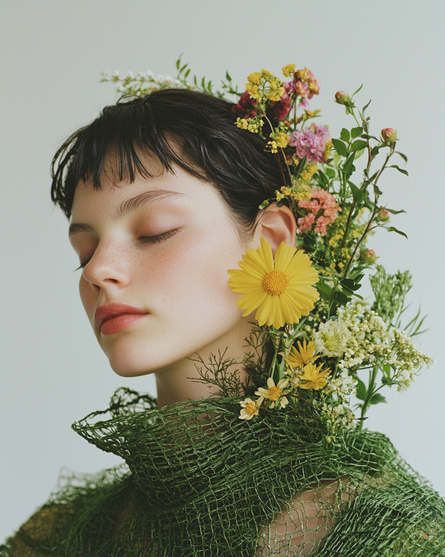 A serene portrait of a woman with floral adornments and a green mesh outfit, blending natural beauty with artistic elegance.