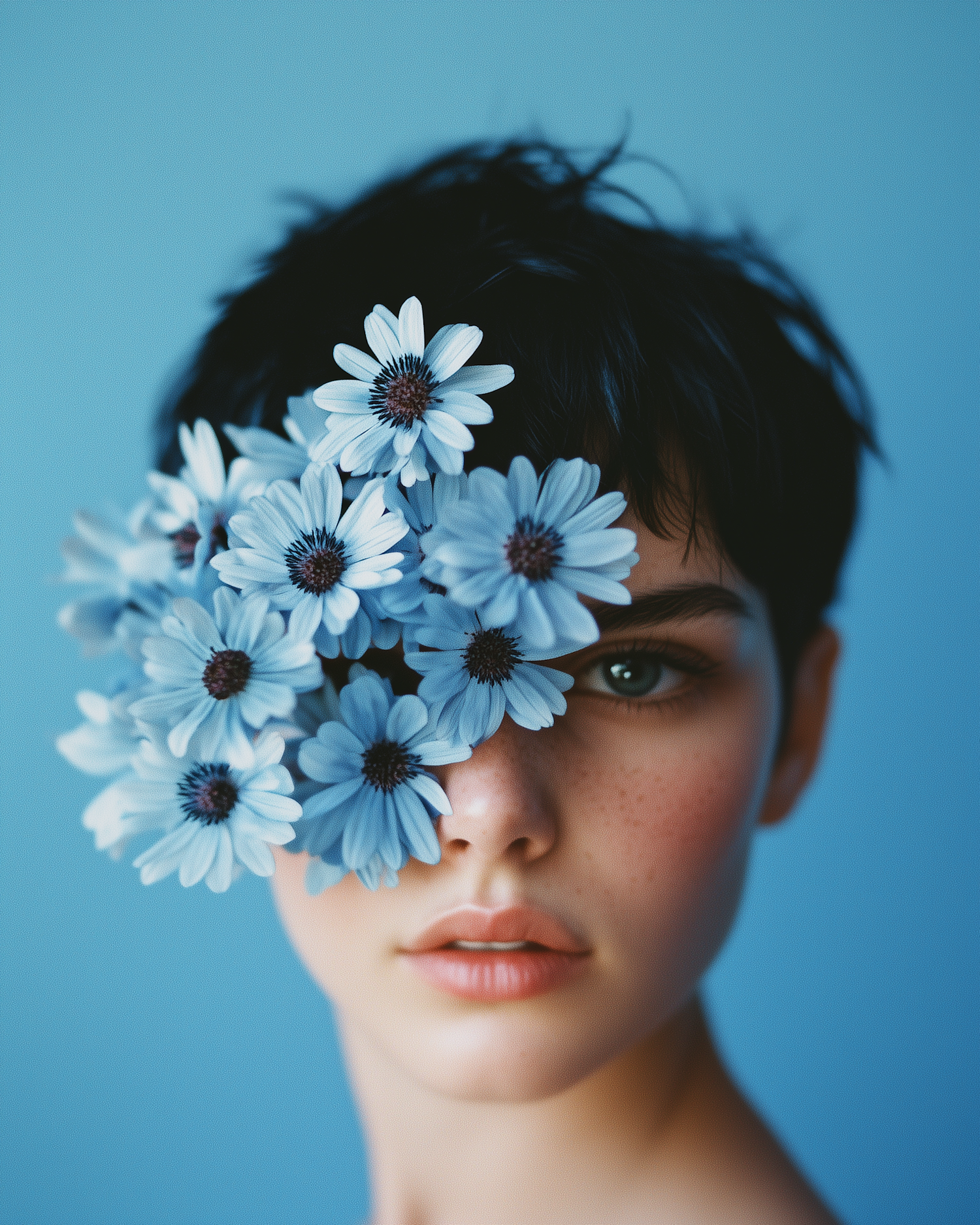 A serene portrait of a woman with short dark hair, adorned with blue daisies against a matching blue background.