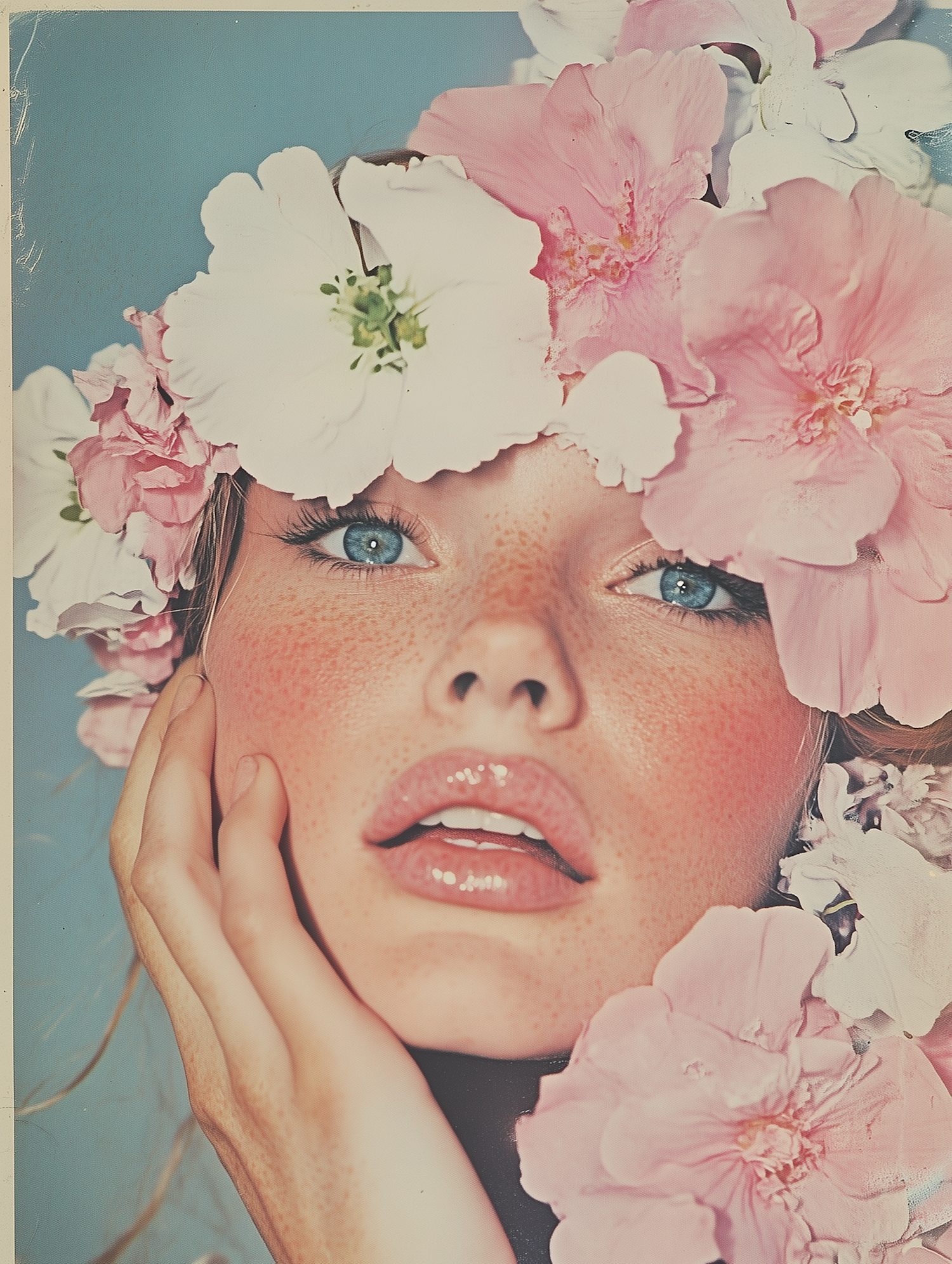 Close-up of a serene face with freckles, blue eyes, and a crown of pink and white flowers, set against a soft blue background.