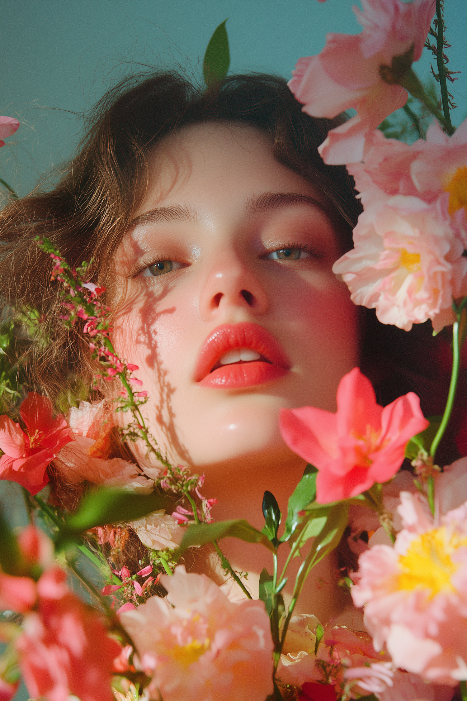A dreamy close-up of a young woman surrounded by vibrant pink and yellow flowers, with glowing skin and soft coral lips.
