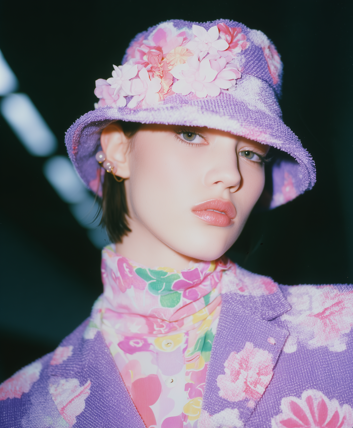 A vibrant close-up of a person in a purple floral outfit and hat, showcasing a stylish and colorful fashion statement.