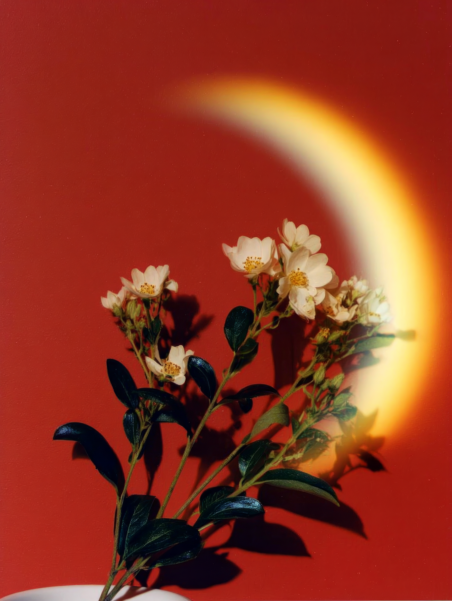 A sprig of white flowers with green leaves against a red background, highlighted by a crescent-shaped light effect.