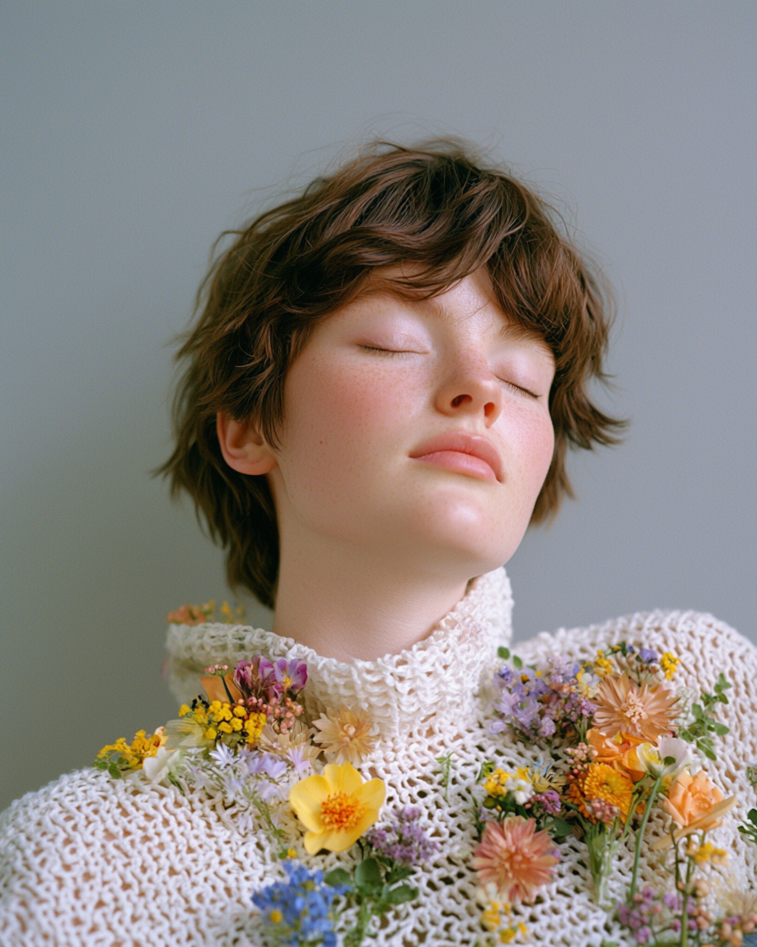 A serene portrait of a woman in a crochet top adorned with vibrant flowers, exuding natural beauty and tranquility.