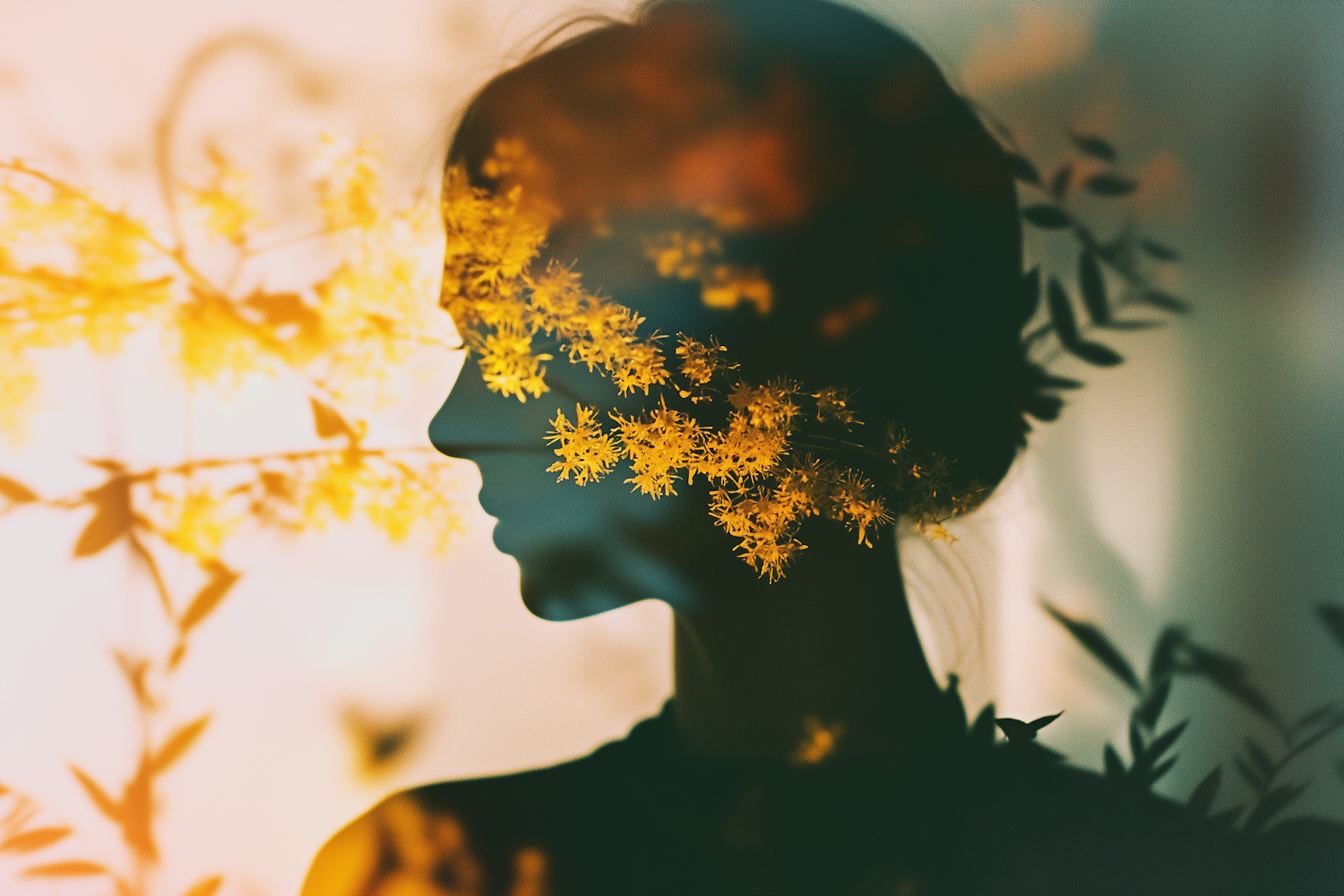 Double exposure of a woman's silhouette with vibrant yellow flowers and green foliage, creating a serene and artistic composition.