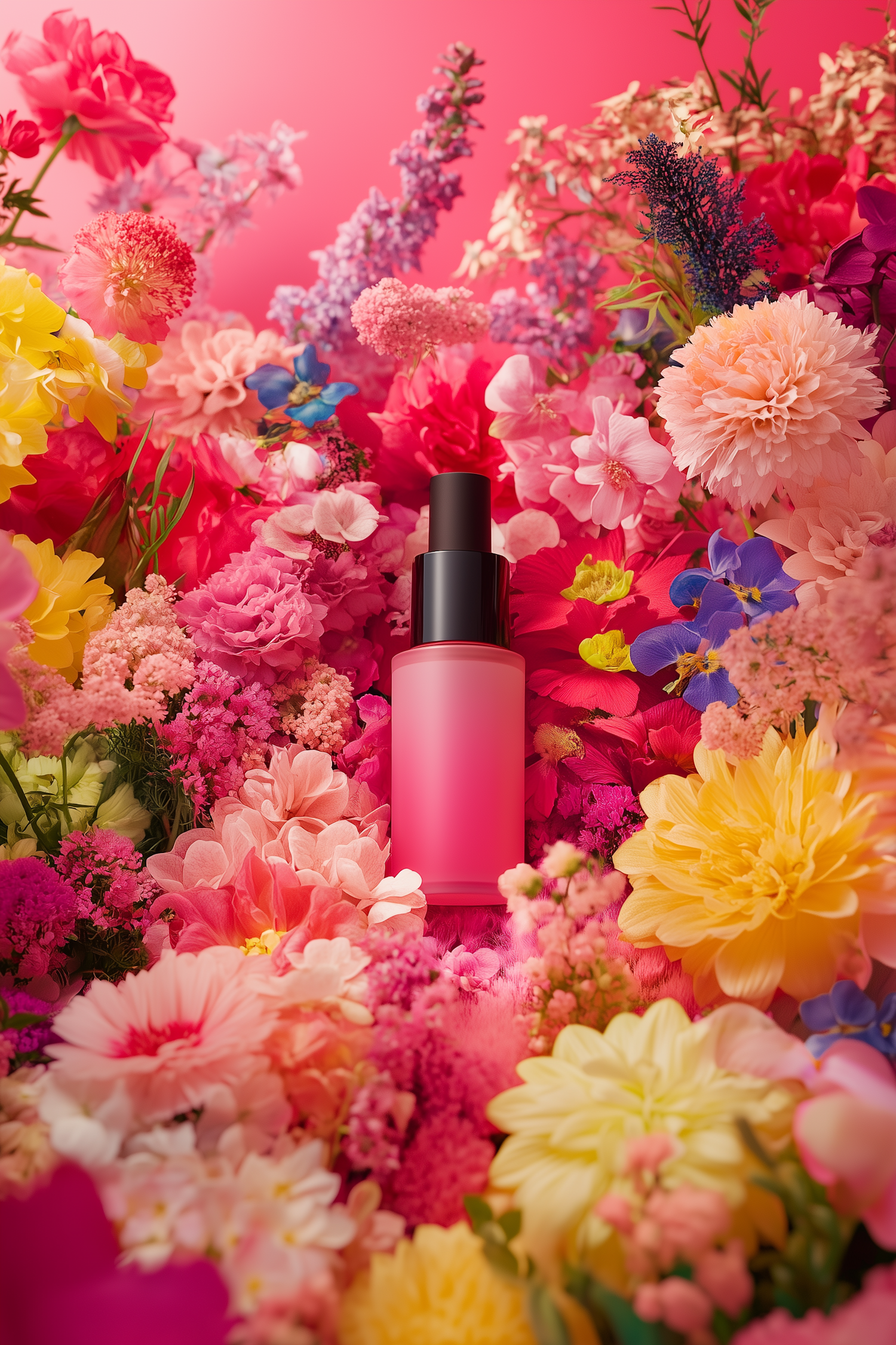 A pink gradient bottle with a black pump surrounded by vibrant flowers in pink, yellow, and purple hues, set against a soft pink background.