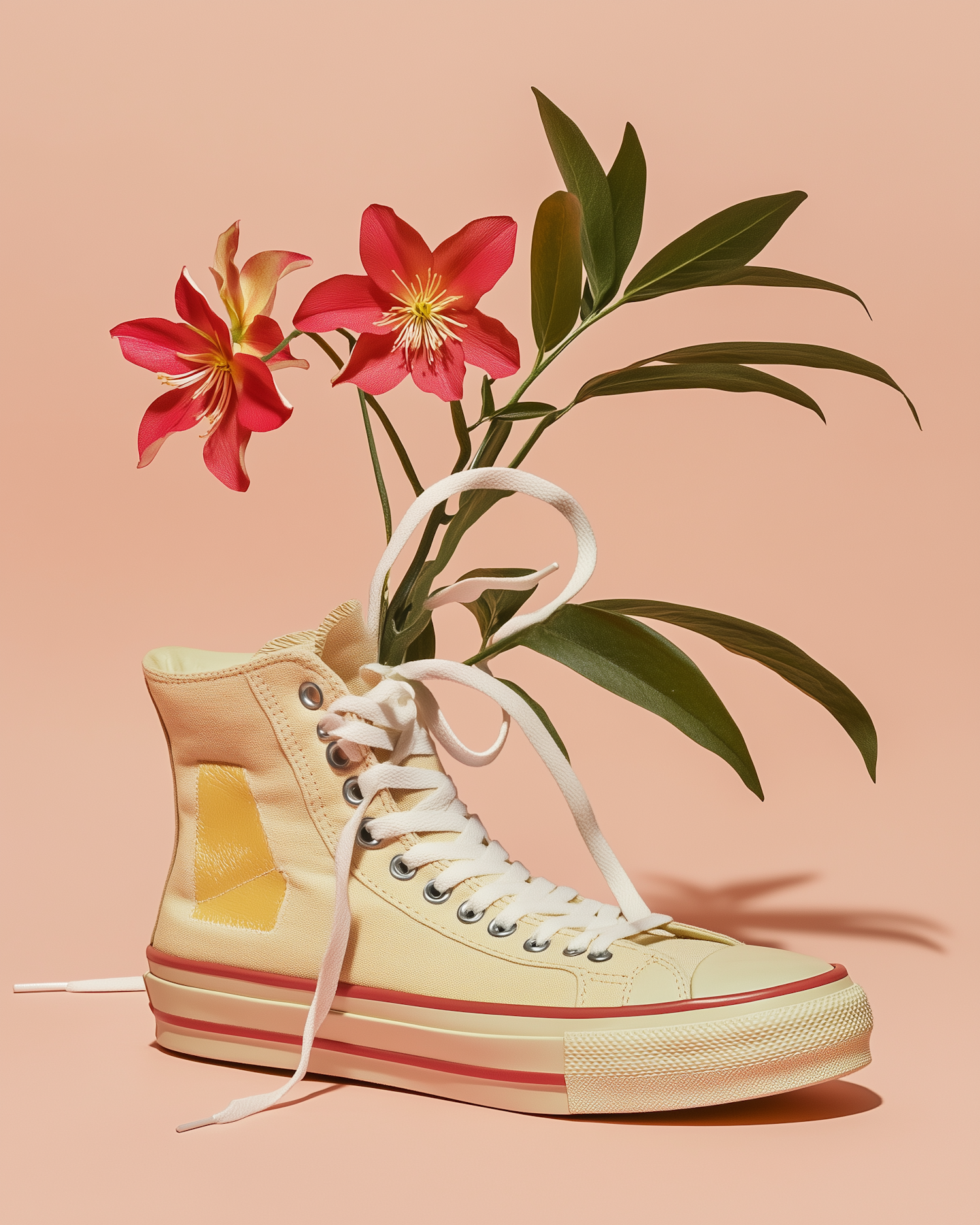 Pastel yellow high-top sneaker with red flowers and green leaves against a peach background, blending fashion and nature.