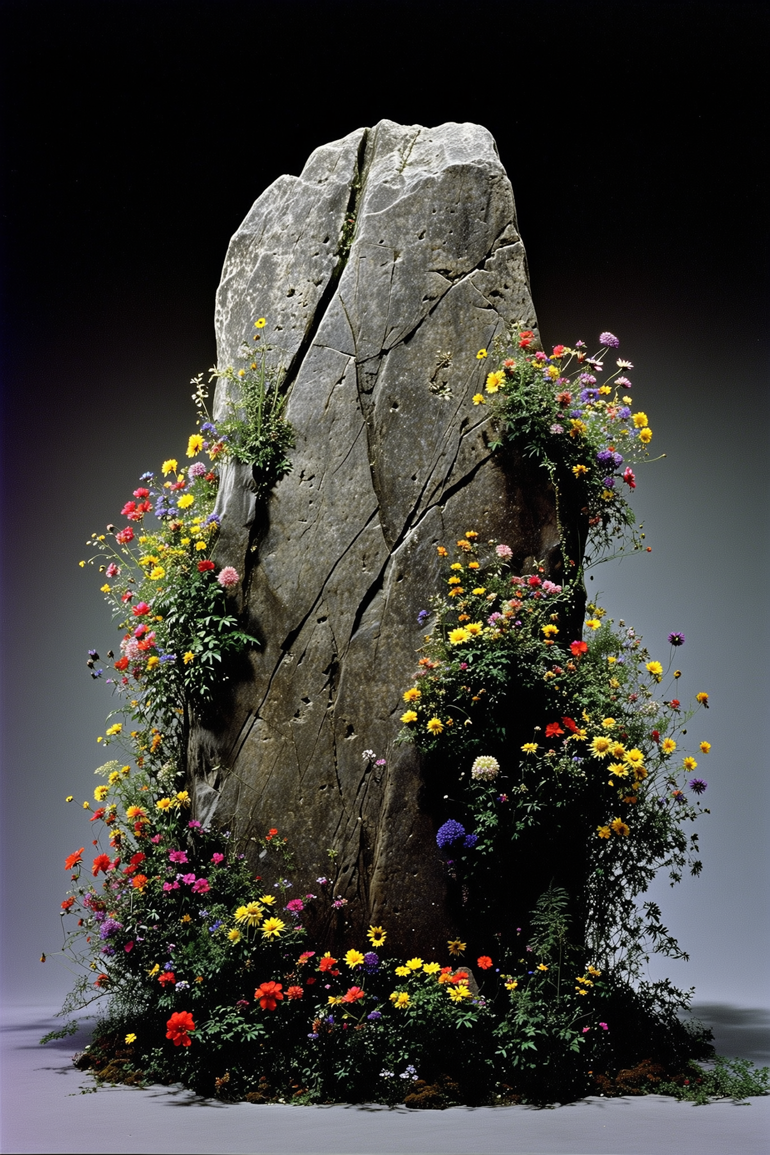 A rugged stone monolith adorned with vibrant flowers in various colors, set against a gradient background, creating a striking natural contrast.