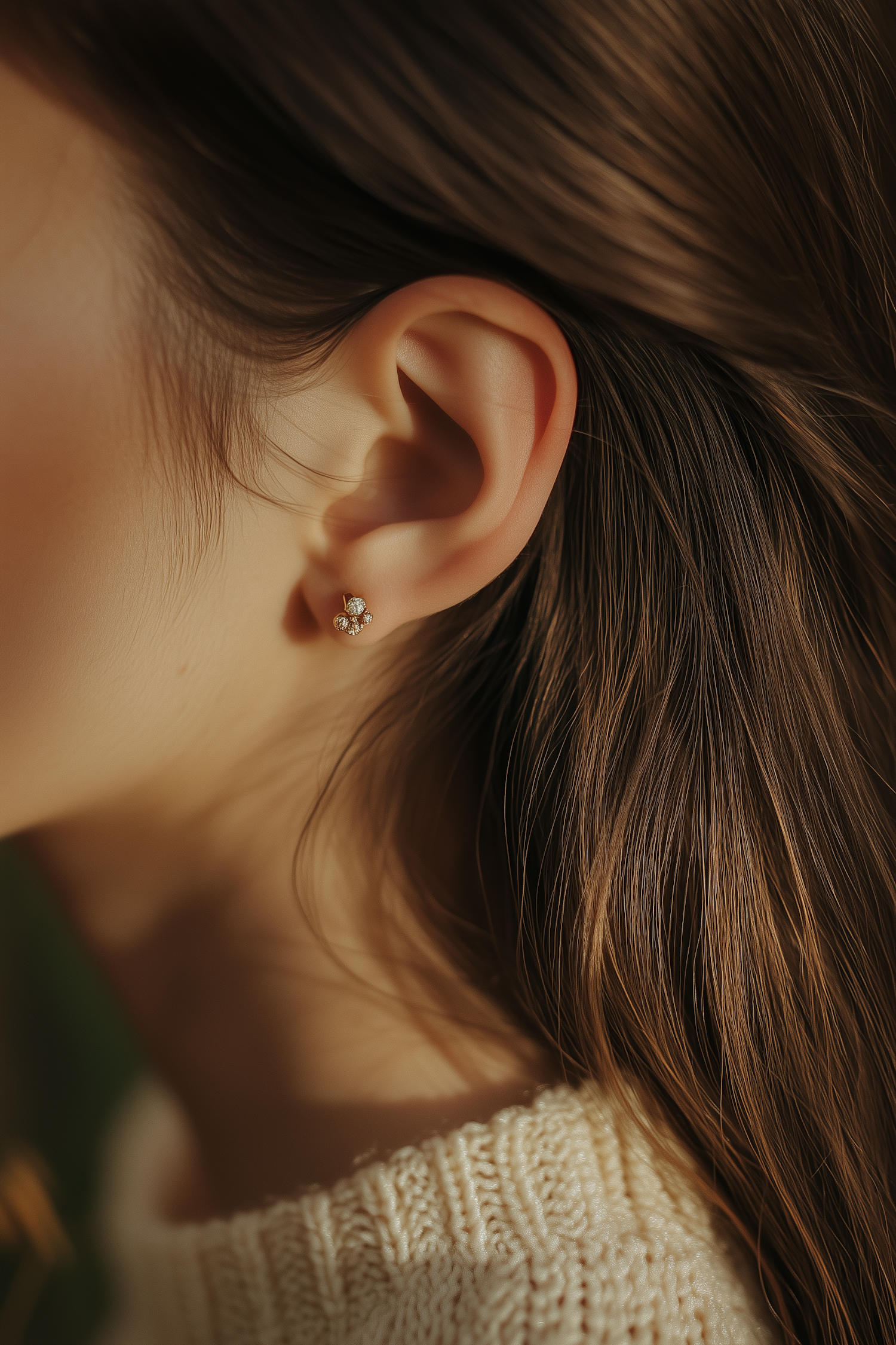 Close-up of a woman's ear with a floral stud earring, light brown hair, and a cozy cream sweater in warm, soft lighting.
